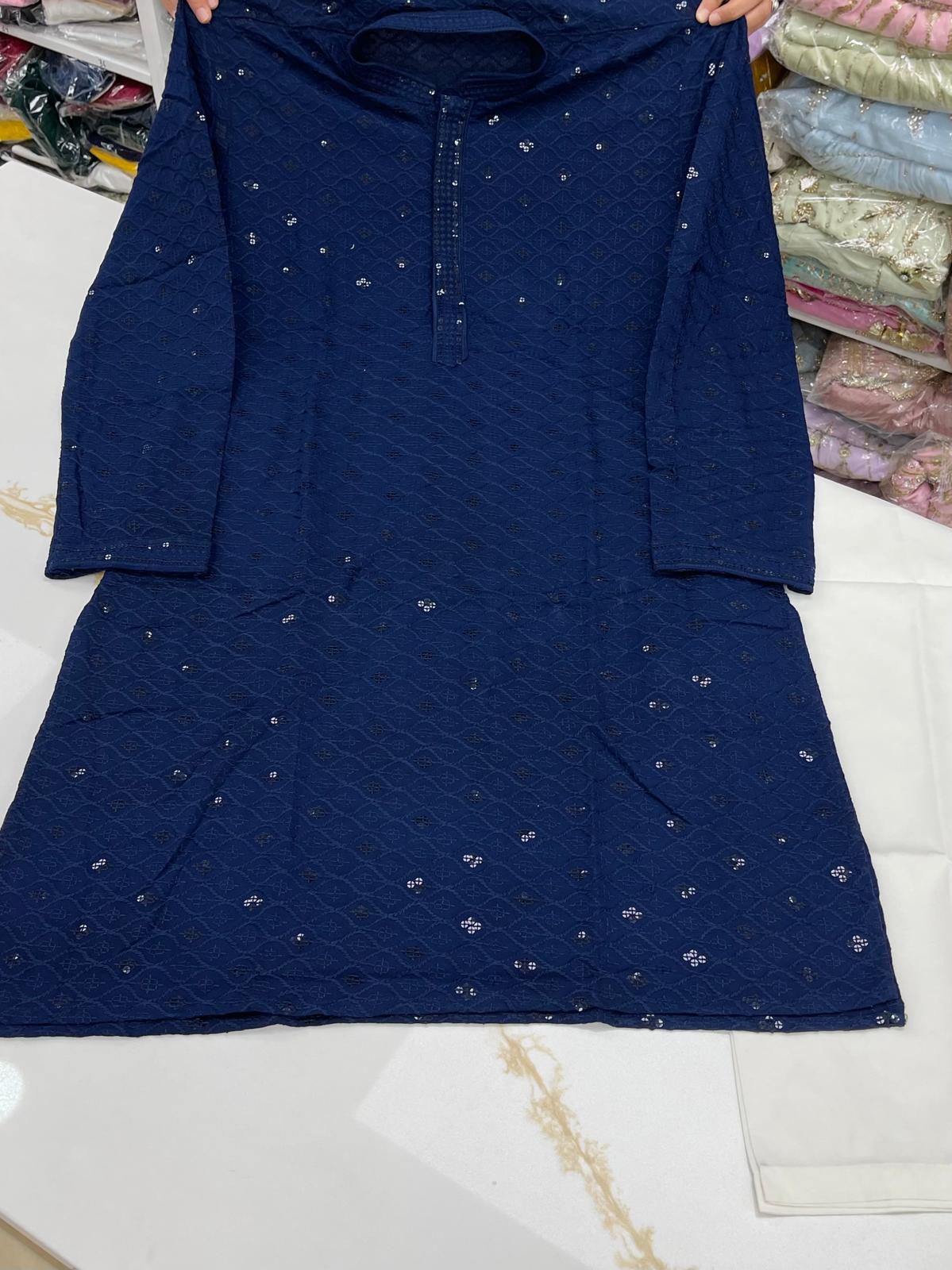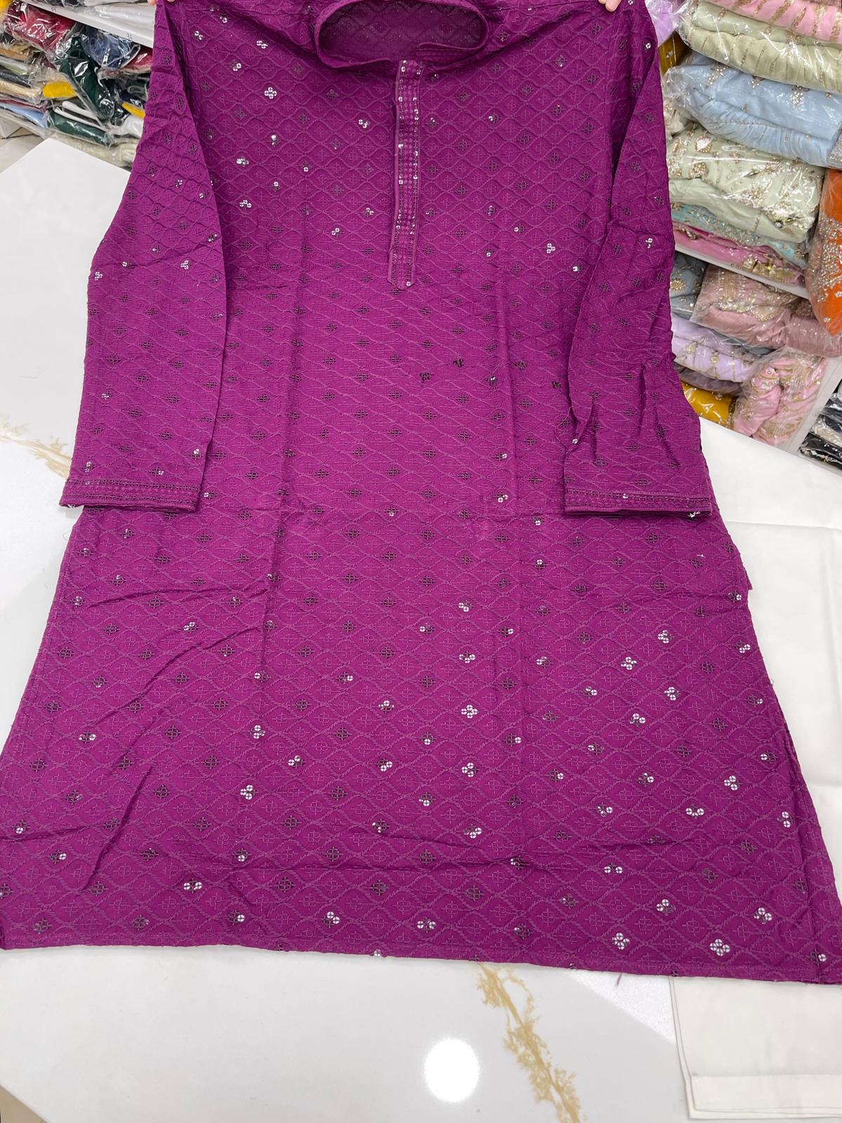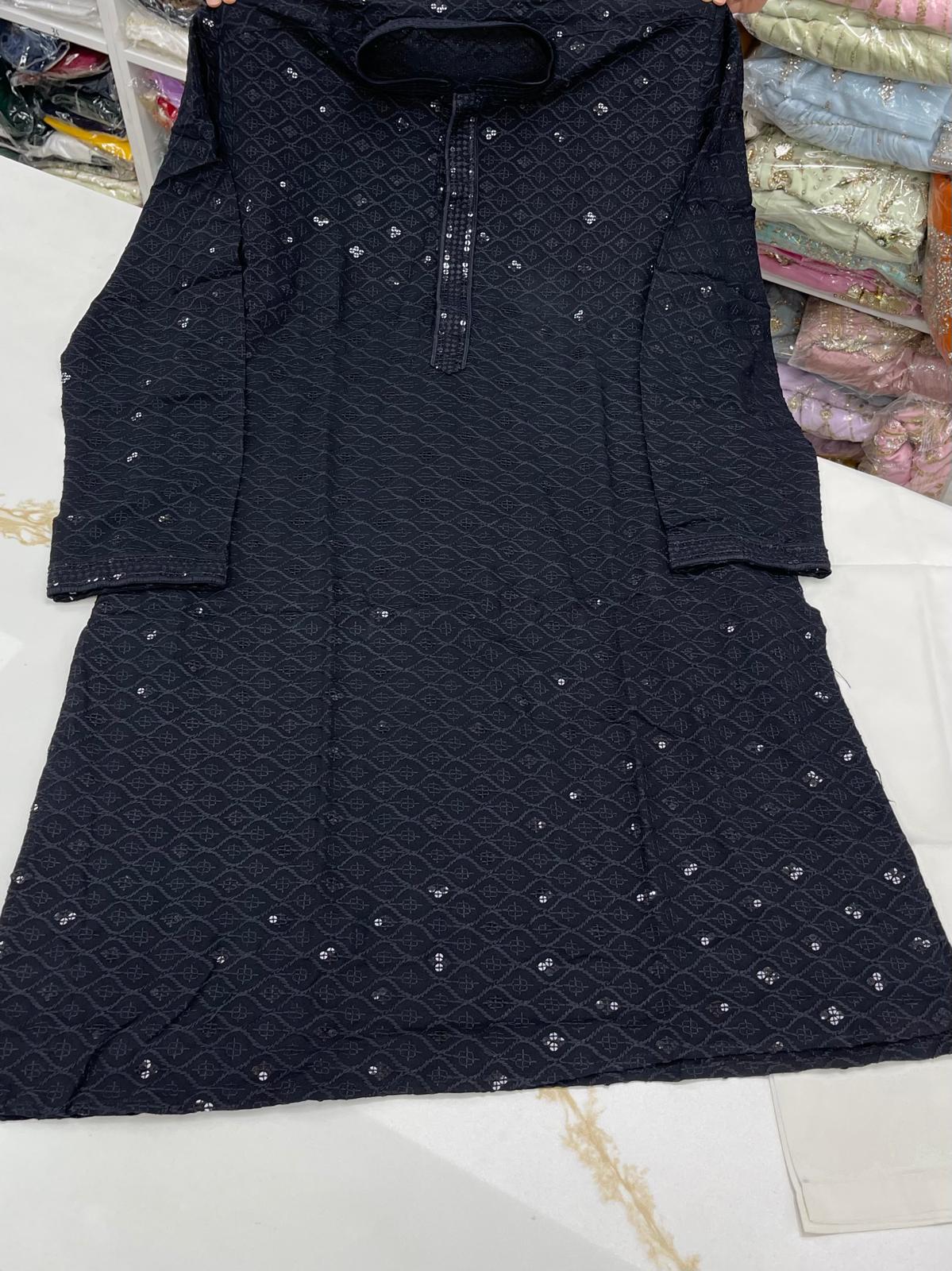 - Handsome Lakhnawi Embroidered with Sequence Work Full Sleeves Rayon Cotton Kurta with Pant Cut Pajama Bottom.