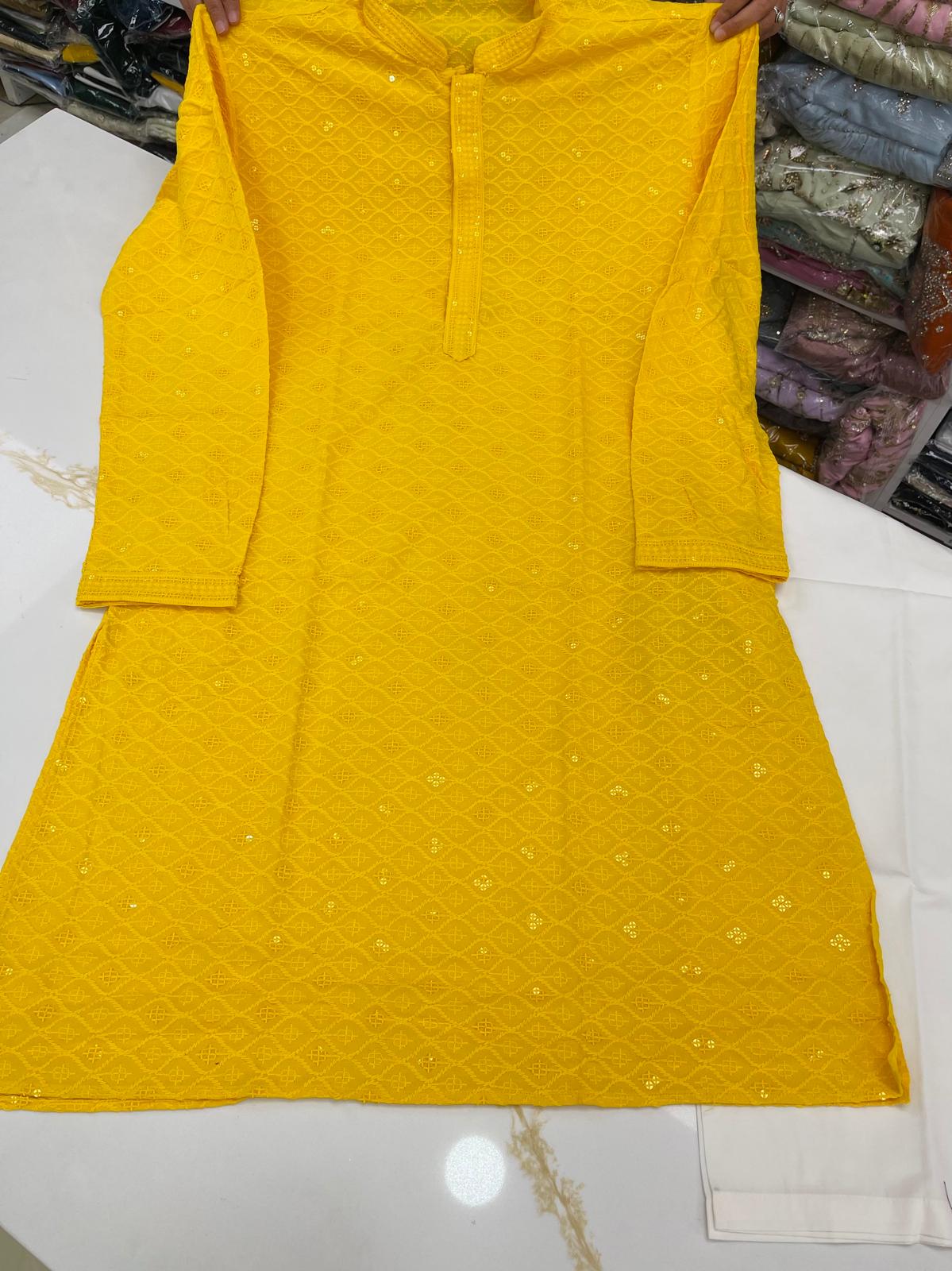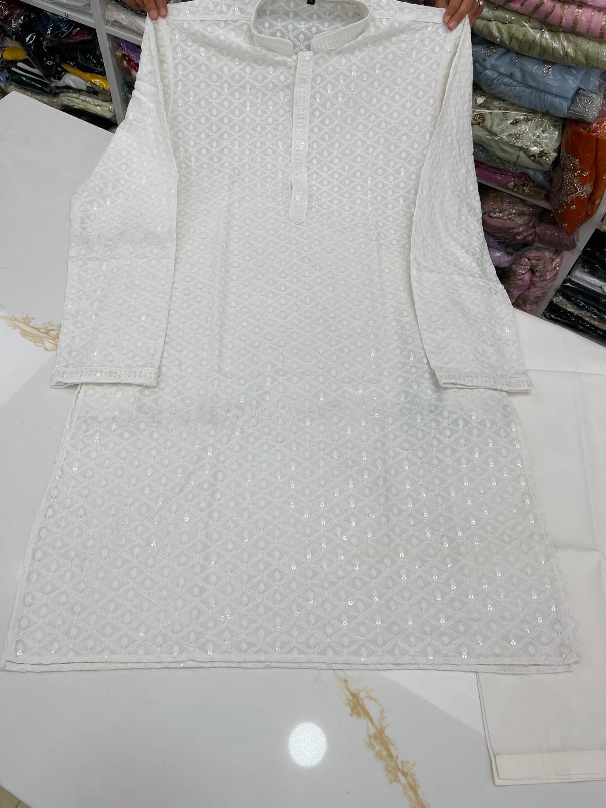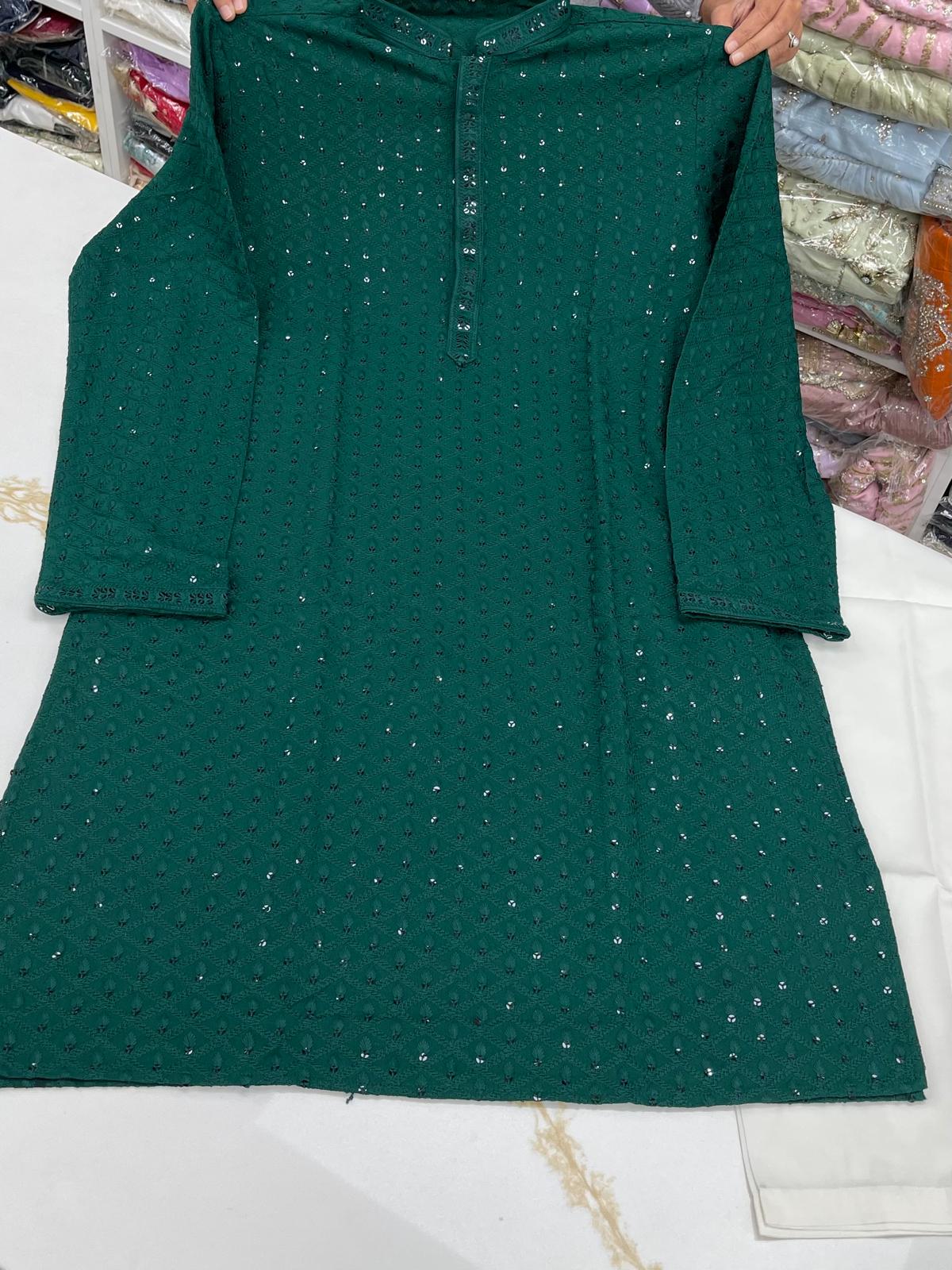 - Handsome Lakhnawi Embroidered with Sequence Work Full Sleeves Rayon Cotton Kurta with Pant Cut Pajama Bottom.