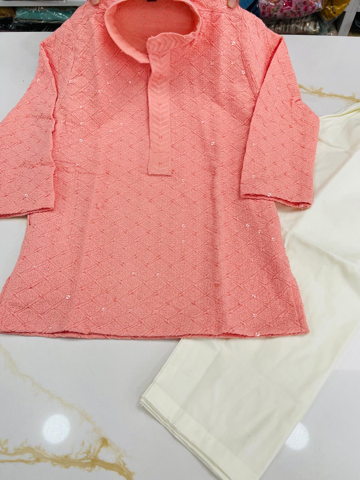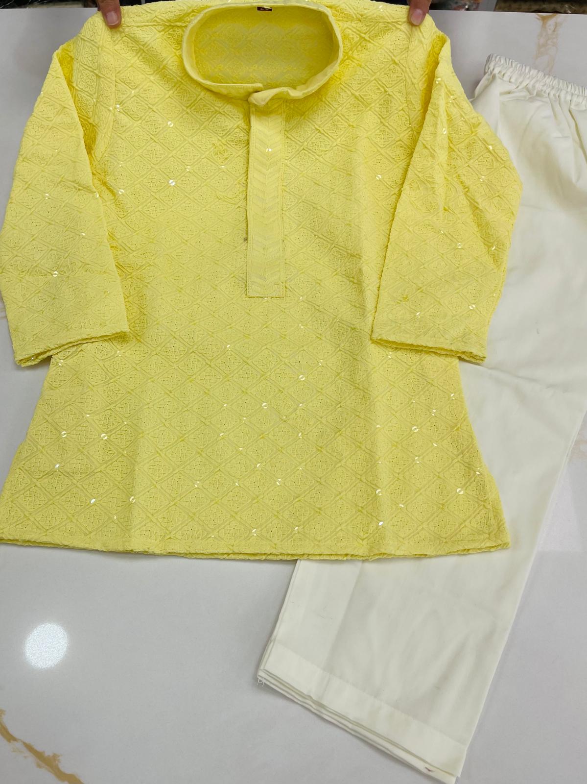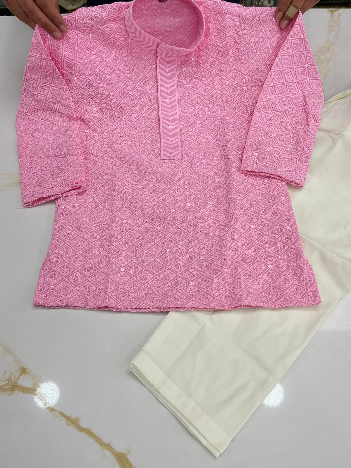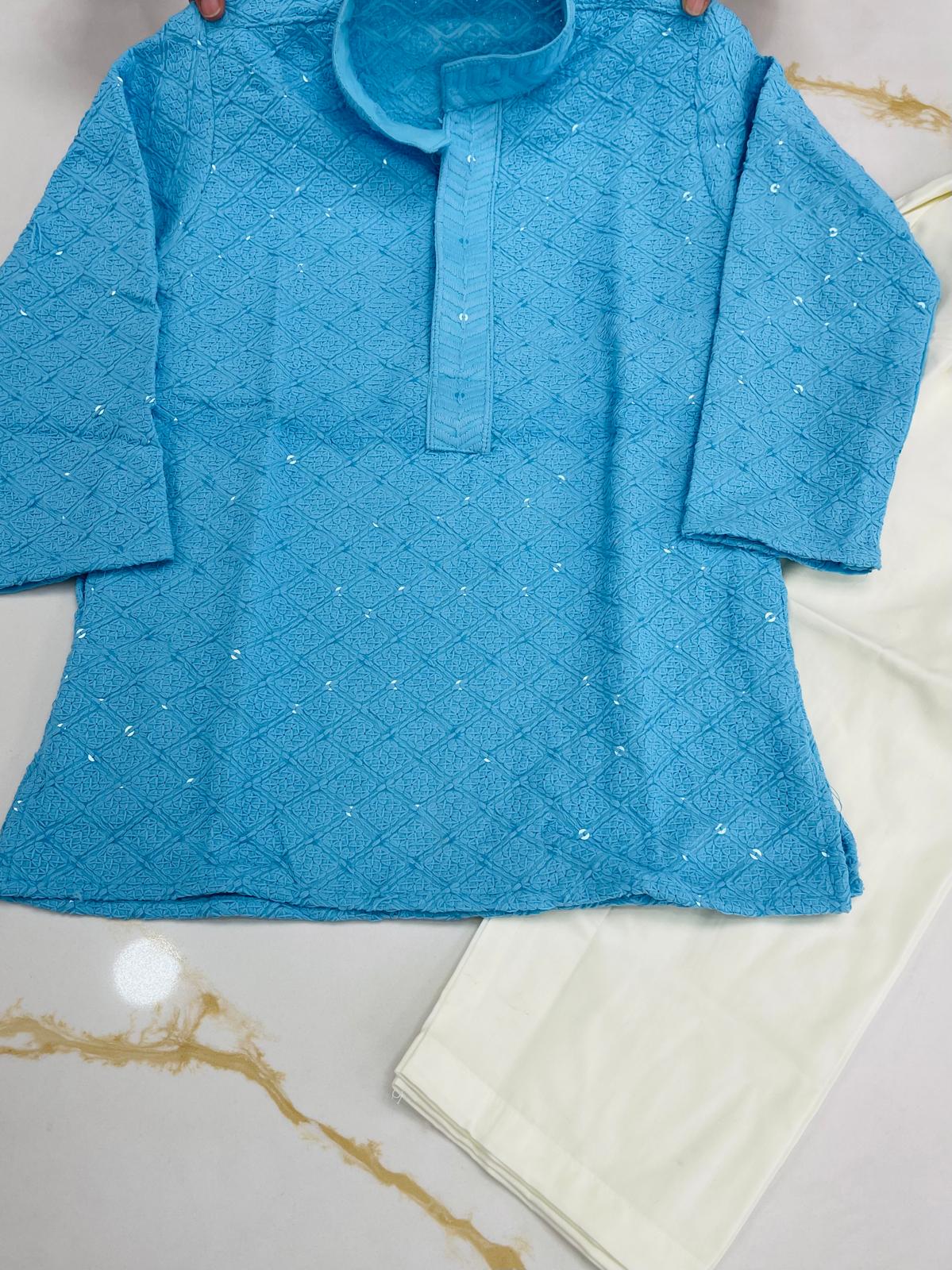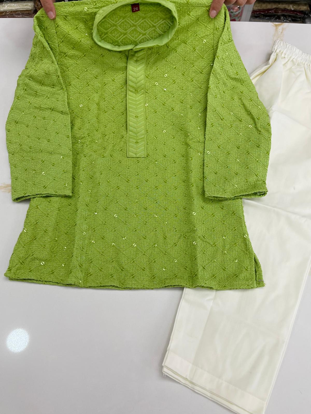 - Elegant Lakhnawi Embroidered with Sequence Work Full Sleeves Rayon Cotton Boys Kurta with Pant Cut Pajama Bottom.