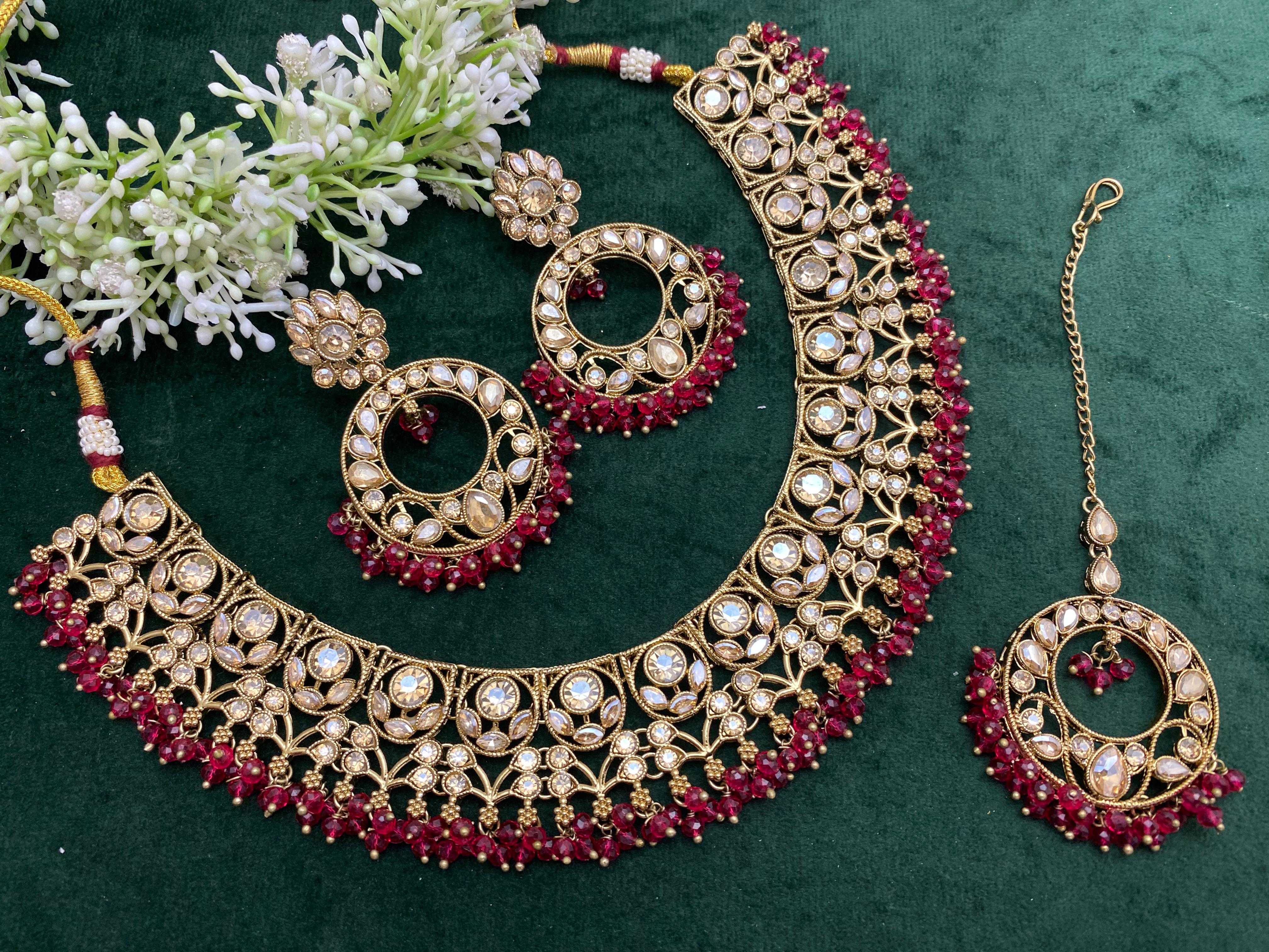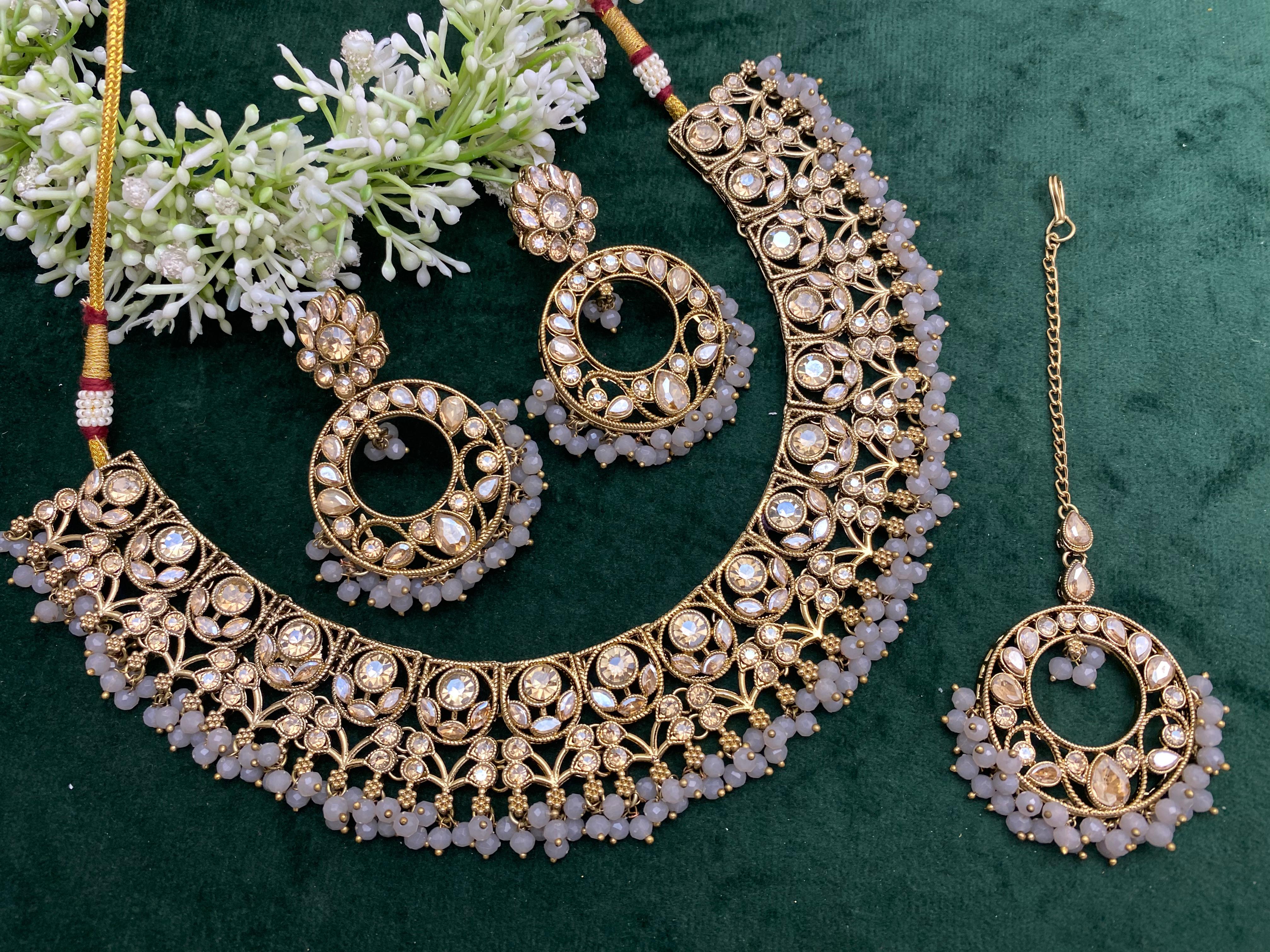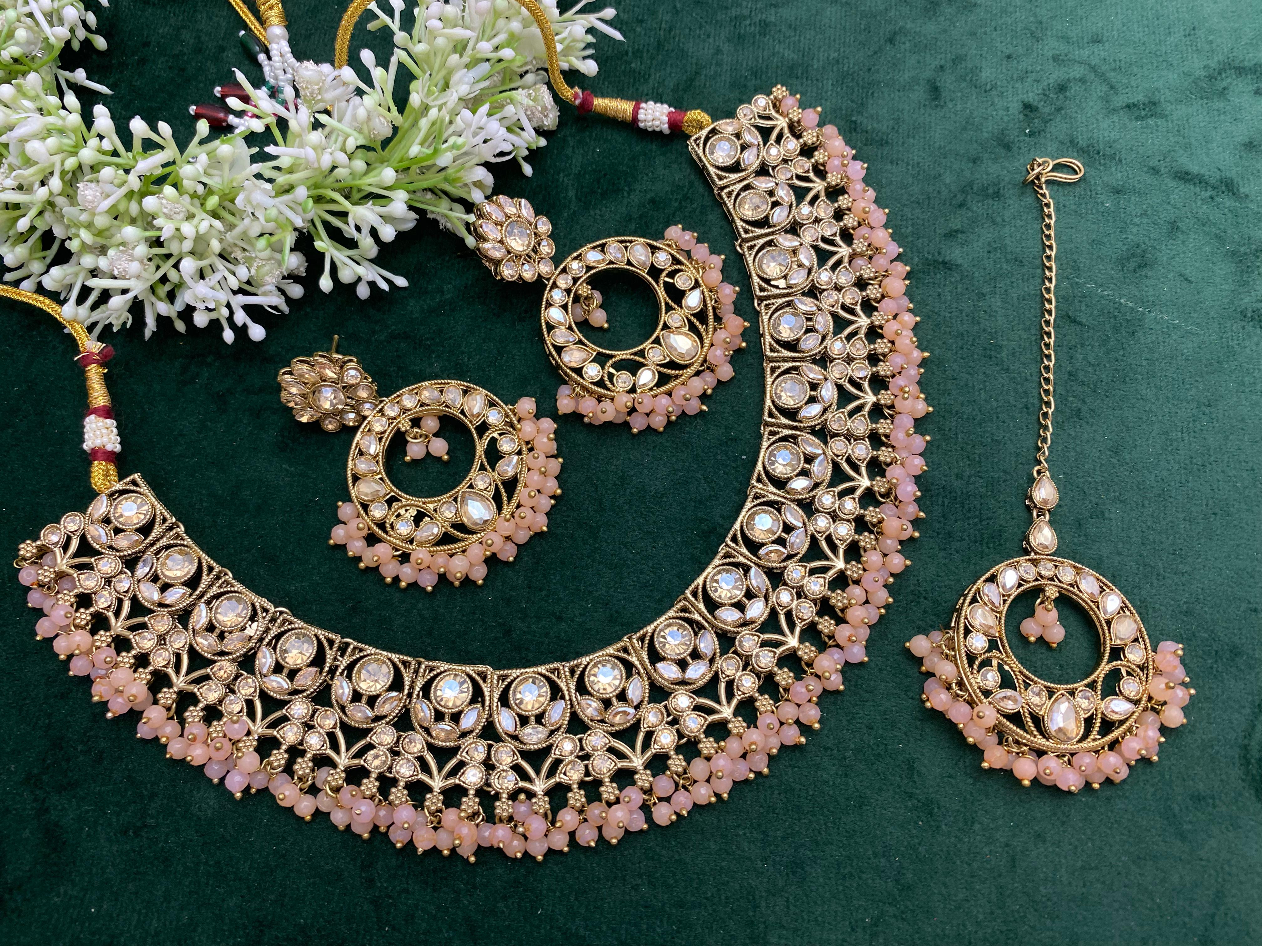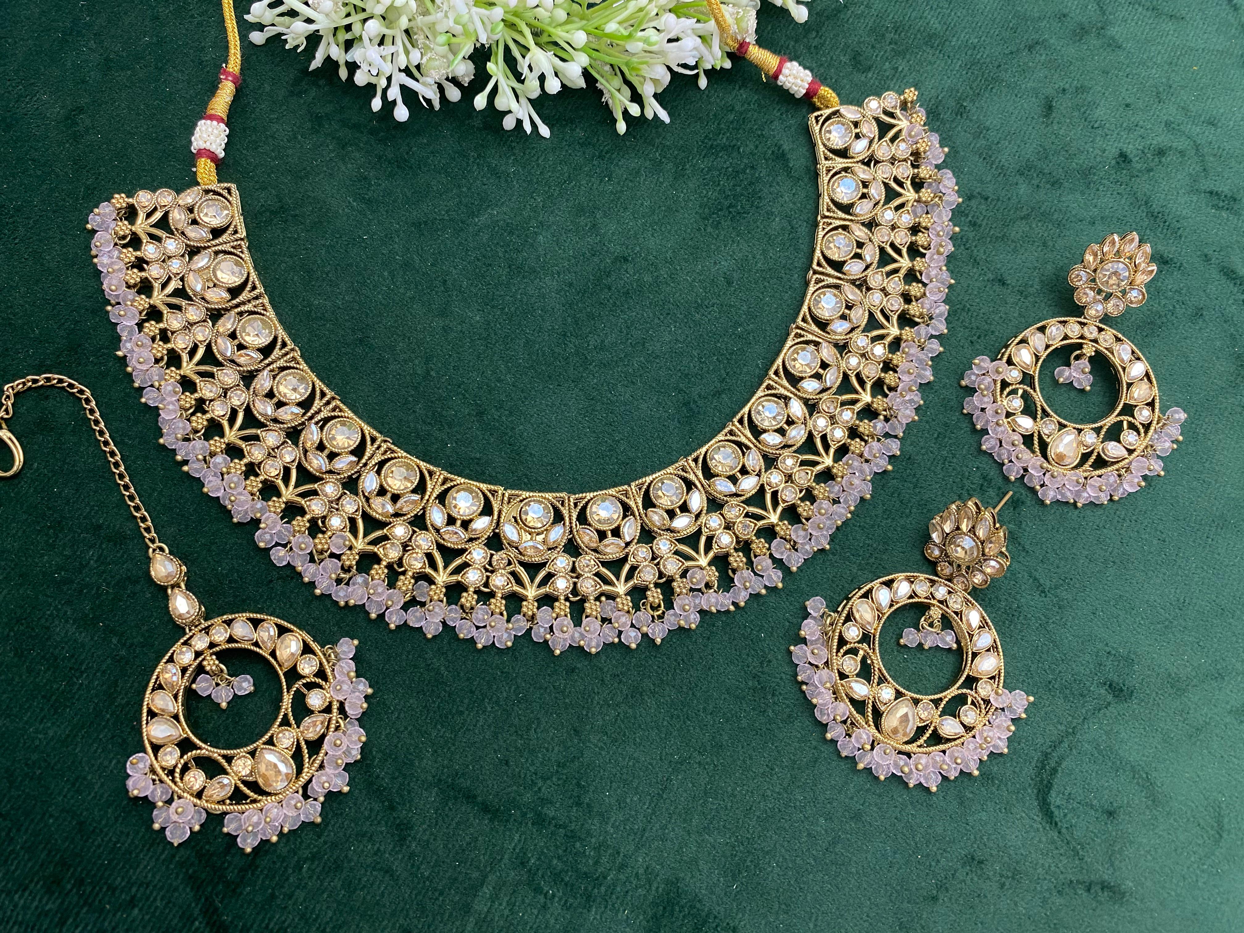 - Beautiful Polki Stone Necklace Set with small pearls with 2 Earrings and 1 Tikka.