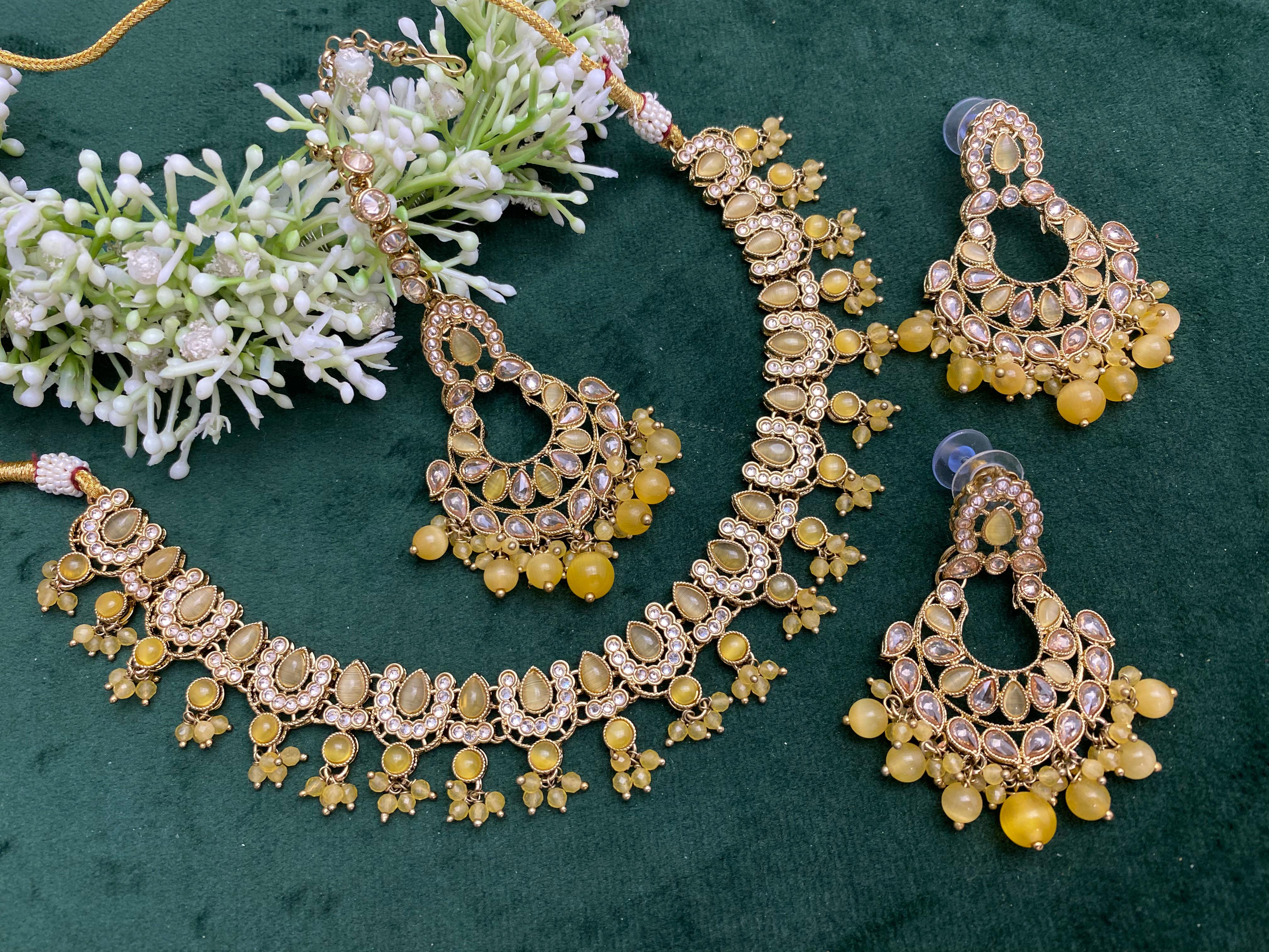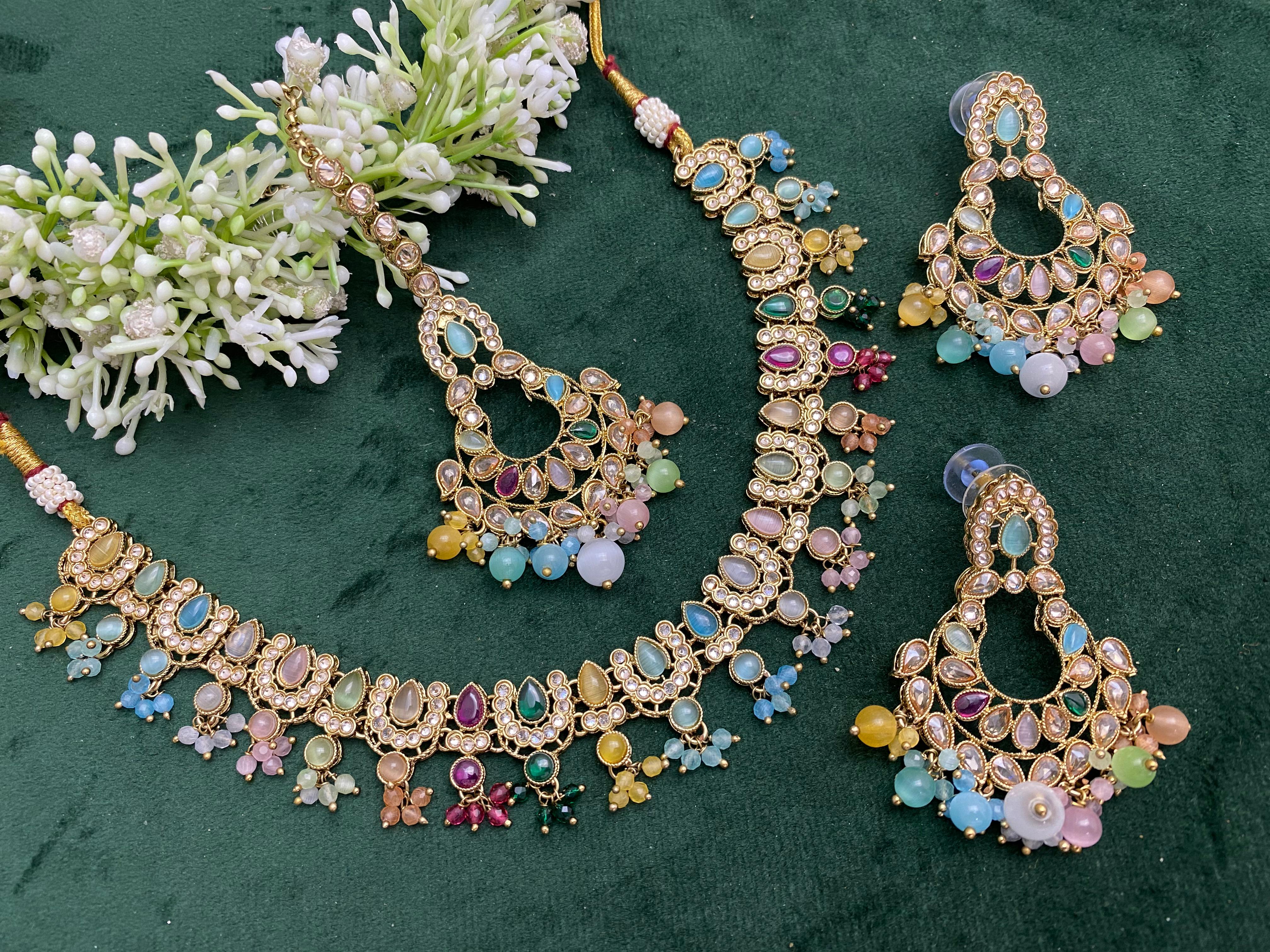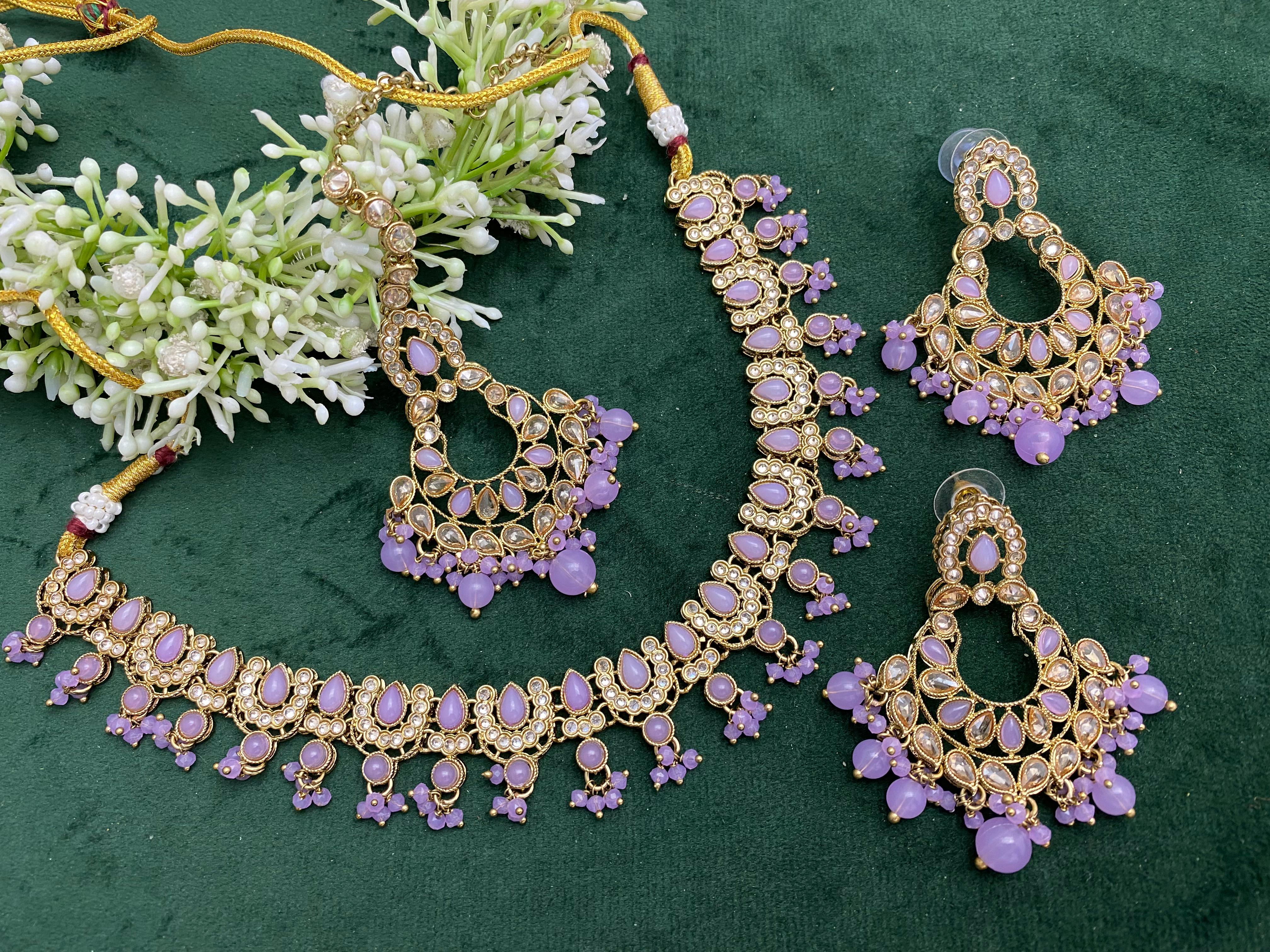 - Elegant Polki Stone Necklace Set with 2 Earrings and 1 Tikka.