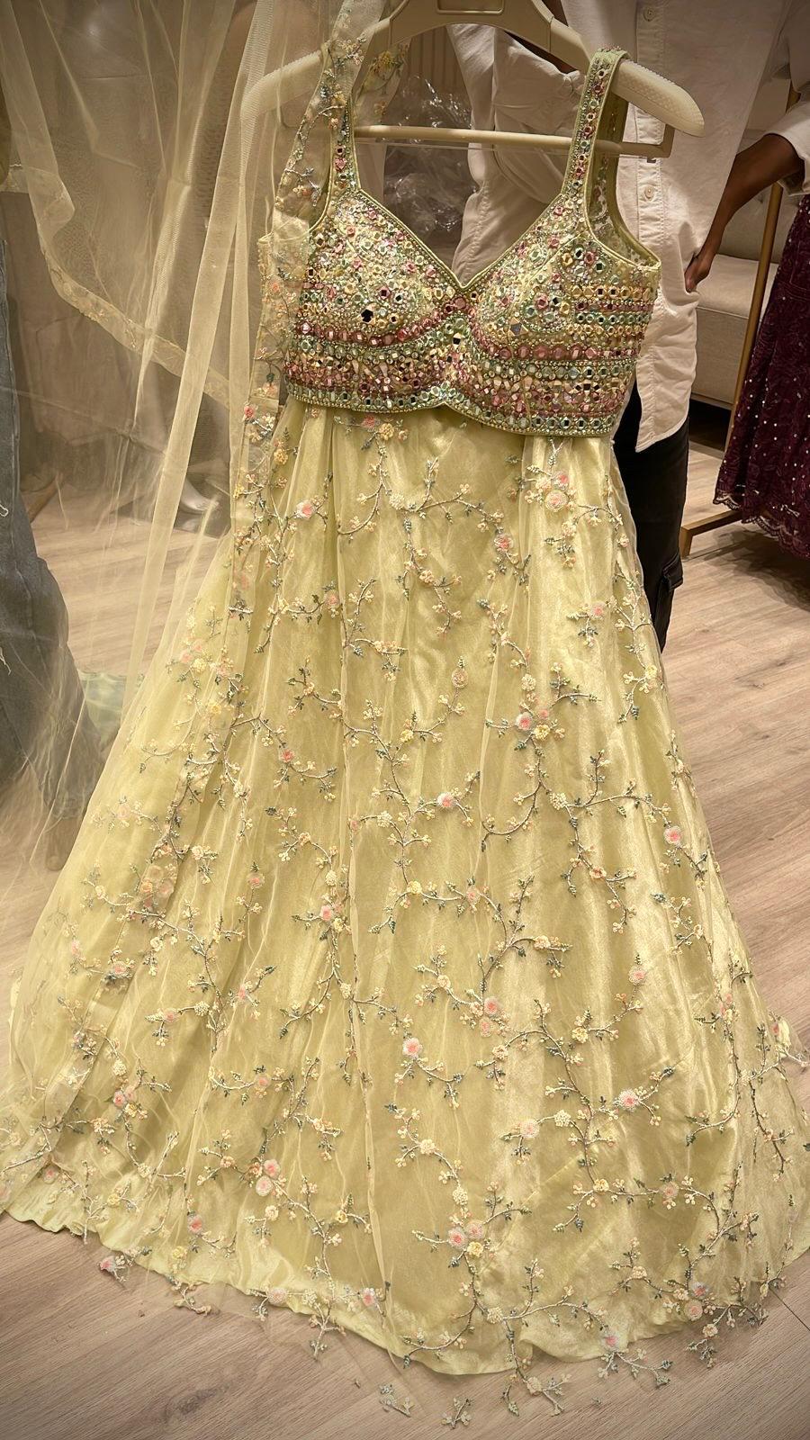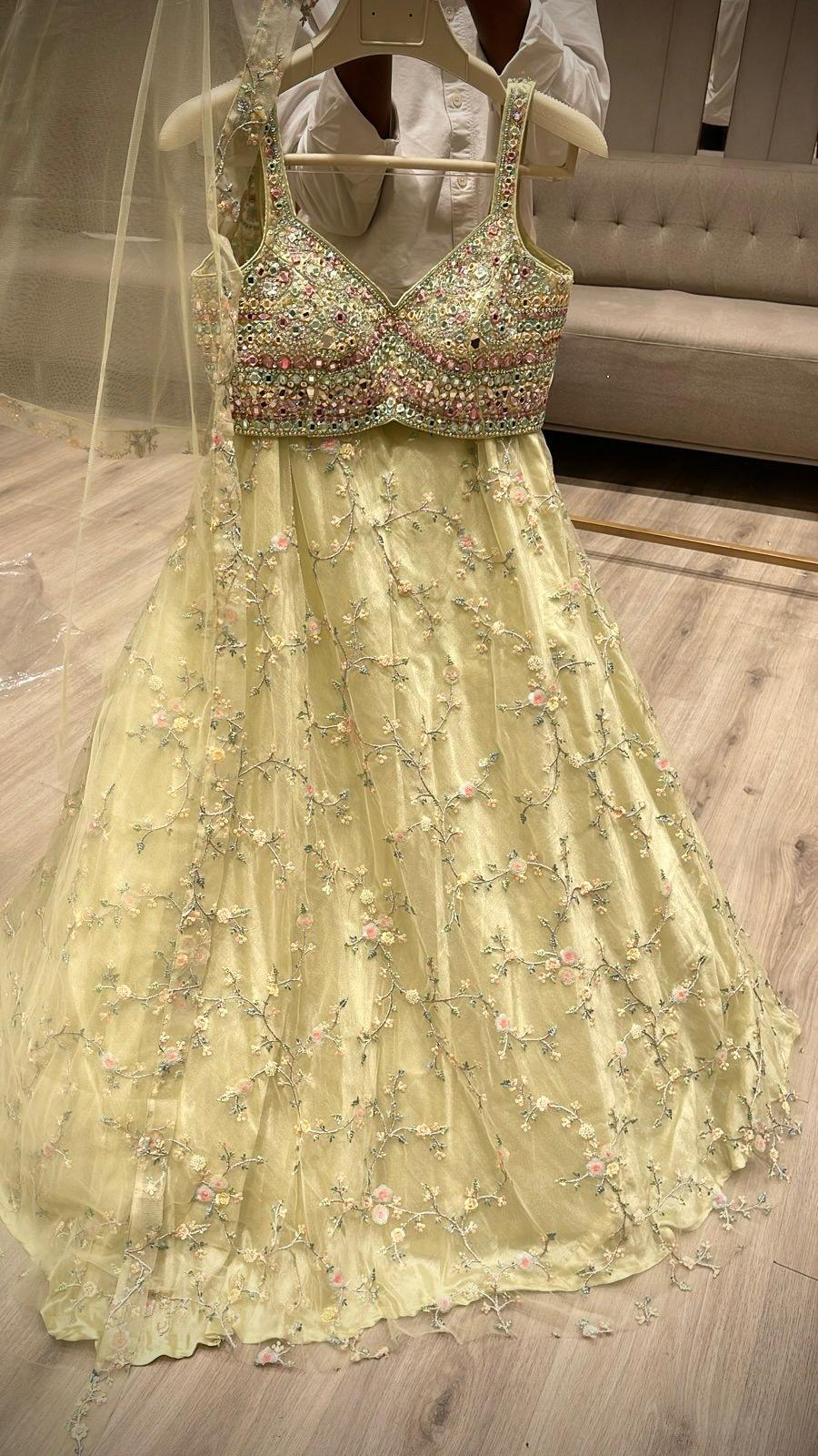 • Designer Hand Embroidered Mint Green Color Crop Top Blouse with Heavy Embroidered Mint Green Color Lehenga Bottom.