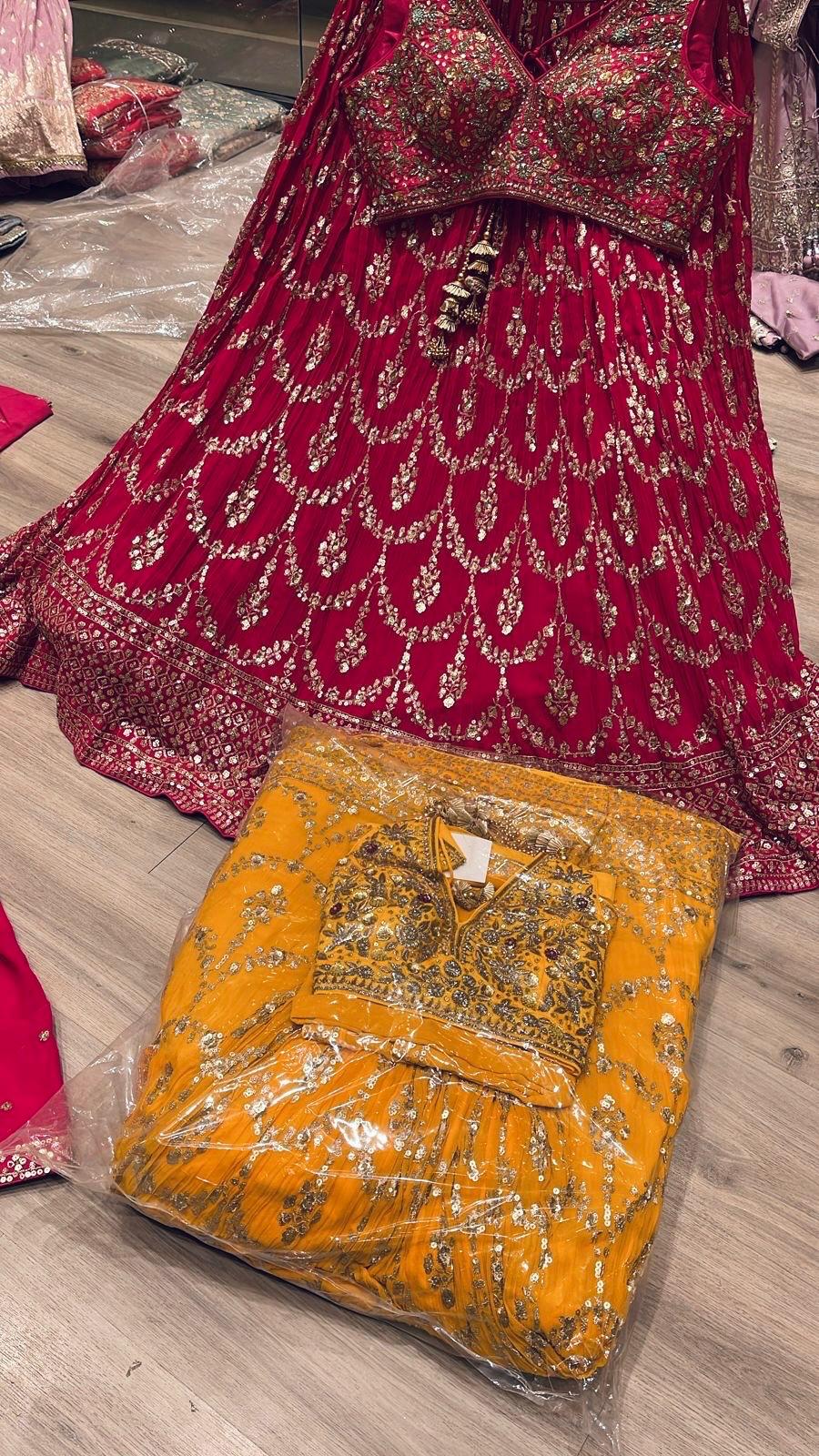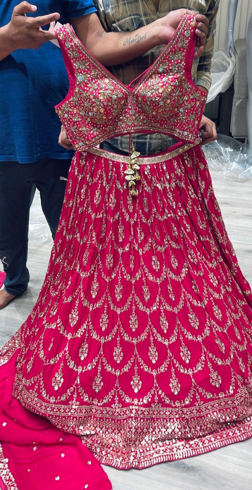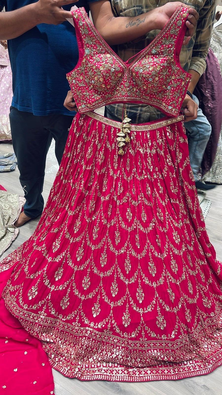 - Extravagant Multi Color Hand Embroidered Crop Top Blouse with Heavy Embroidered Lehenga Bottom.