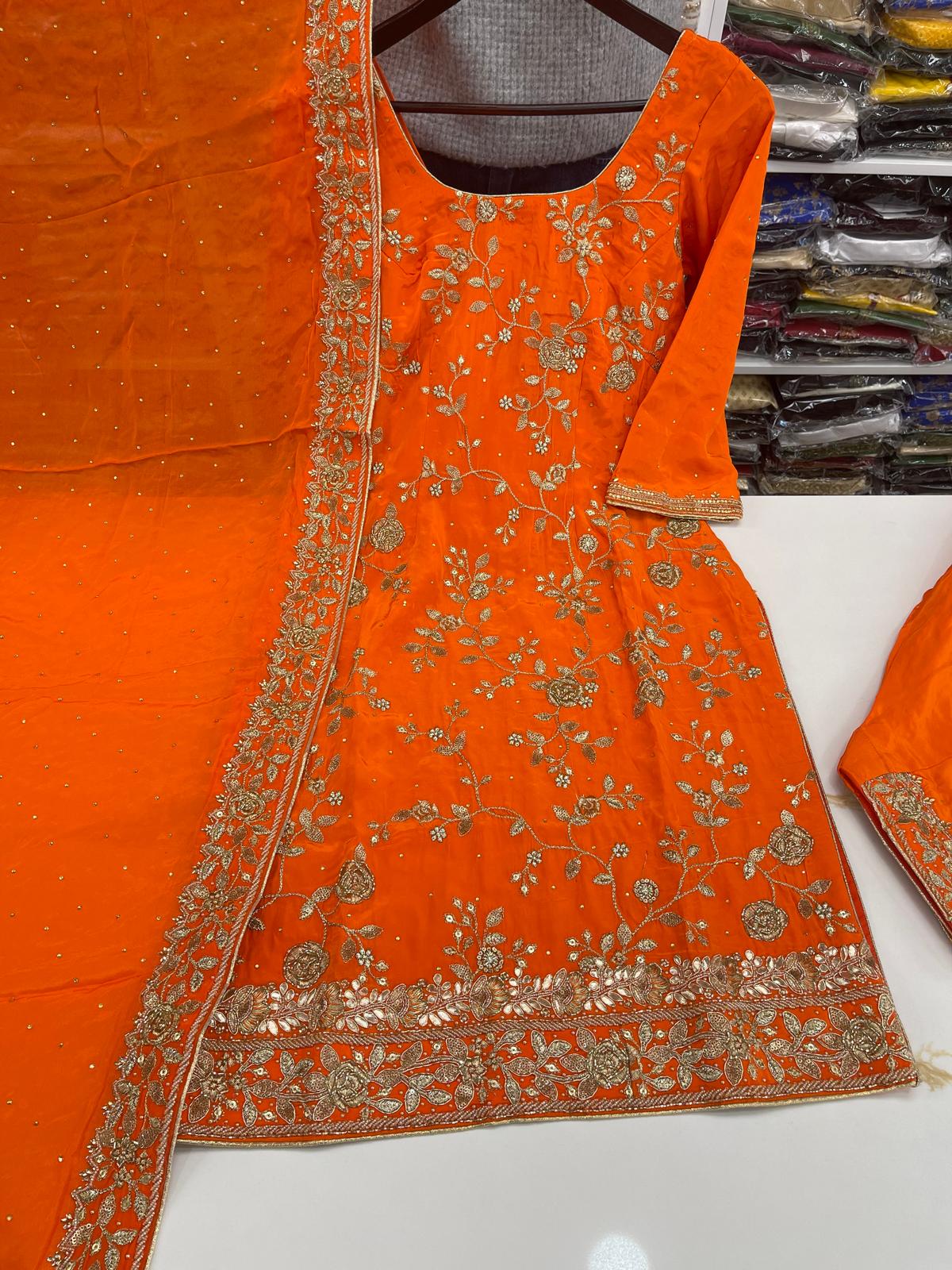 - Boutique Embroidered Pure Crepe Full Sleeves Shirt with Embroidered Pure Crepe Patiala Salwar Bottom in Orange Rust Color.
