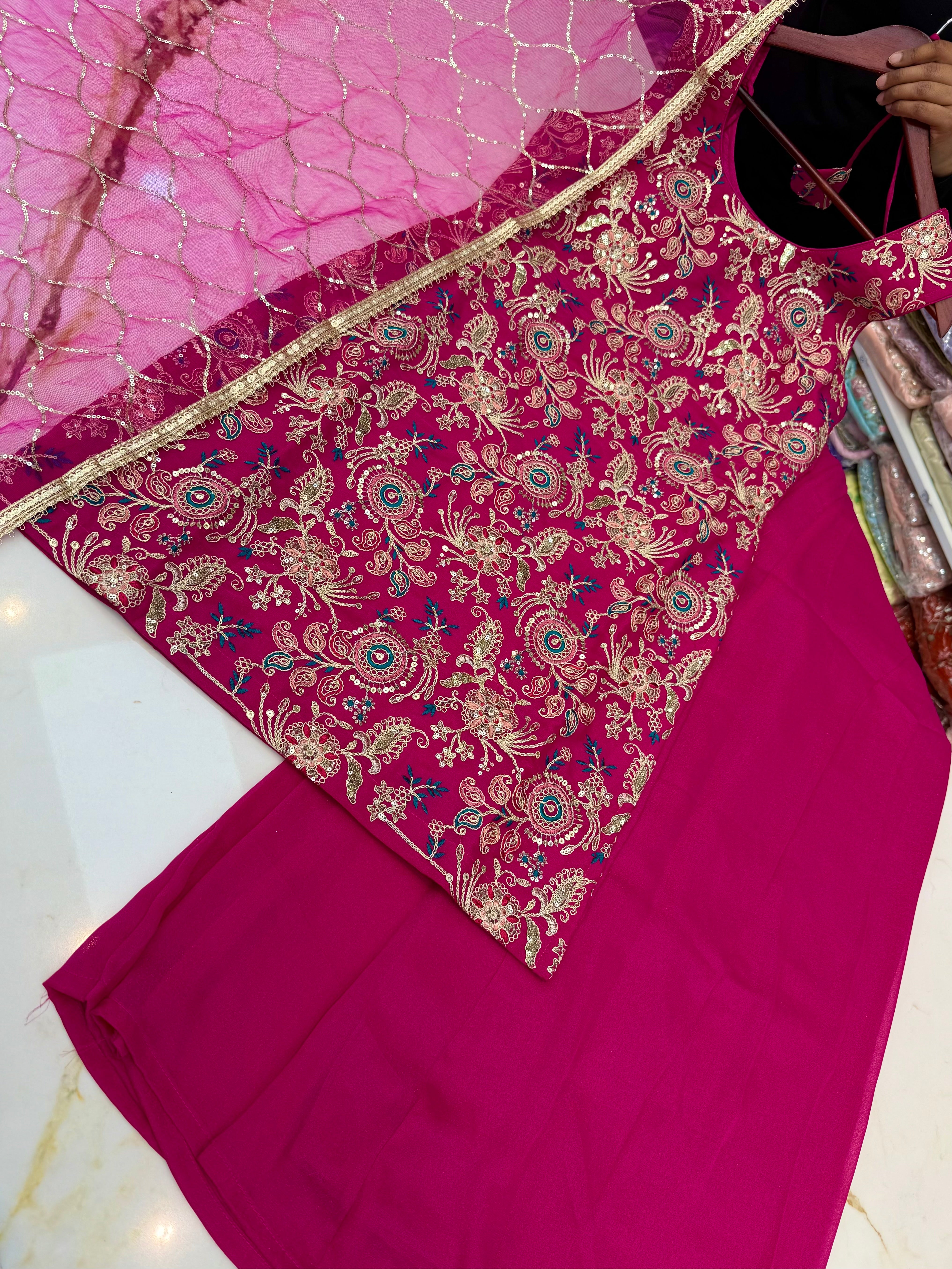 - Beautiful Multi Color Thread & Sequence Embroidered Hot Pink Shirt with Hot Pink Color Palazo Bottom.