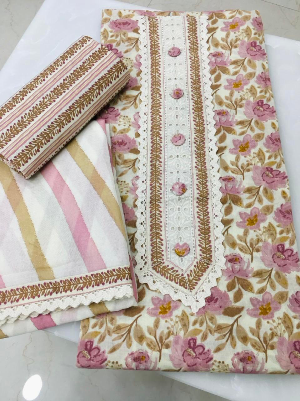Beautiful Pink & Beige Color Floral Print Cotton Unstitched Suit