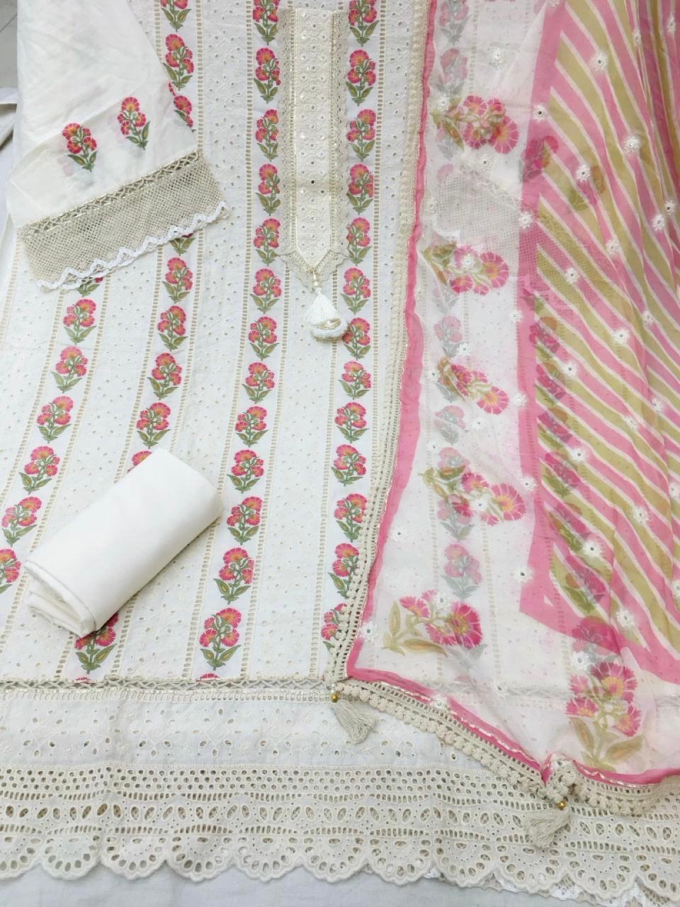 - Beautiful Floral Print Cotton Unstitched Shirt with Plain Creamy White Unstitched Bottom Fabric