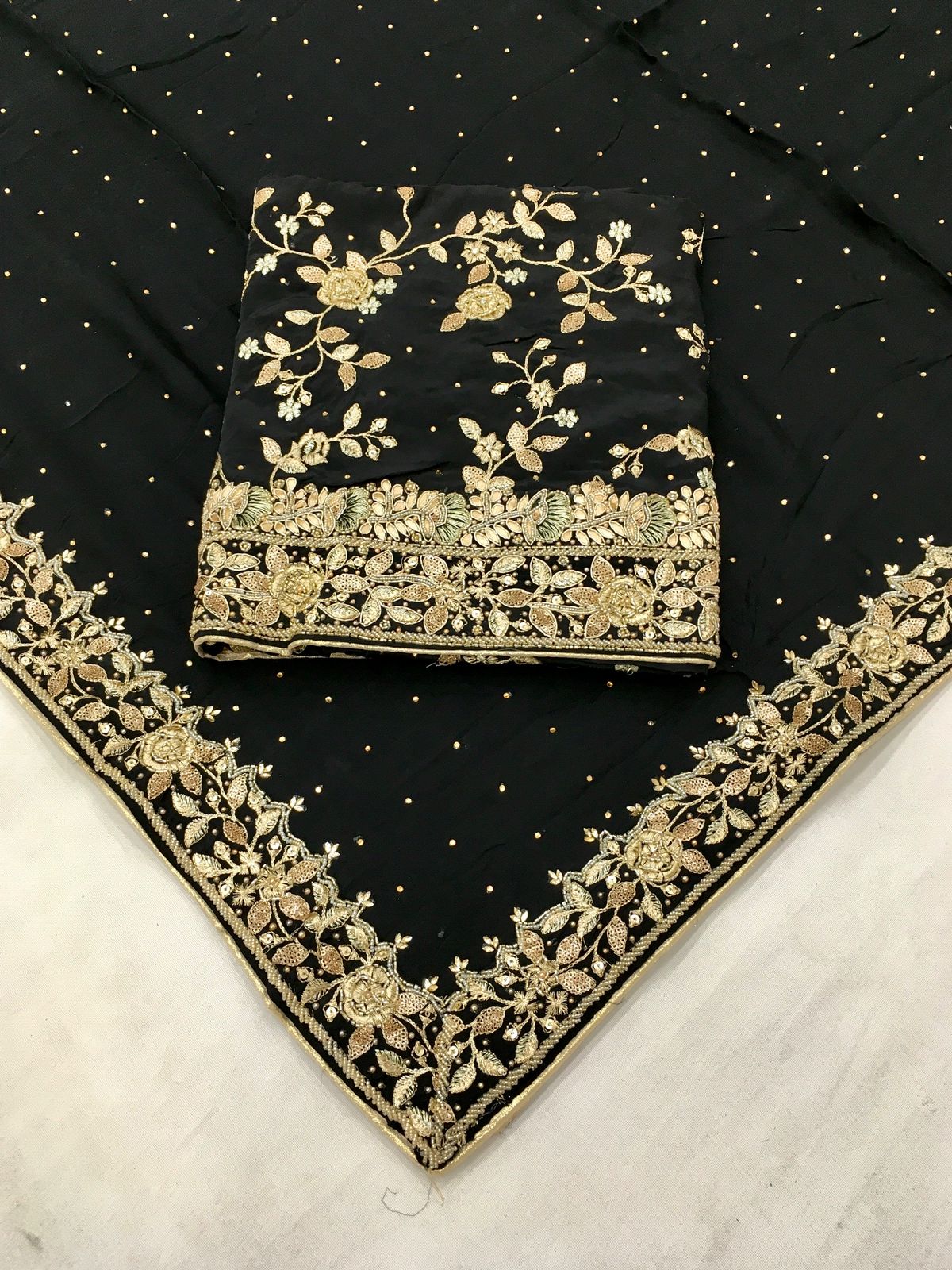 - Beautiful Boutique Embroidered Crepe Shirt with Boutique Embroidered Bottom Fabric in Crepe.