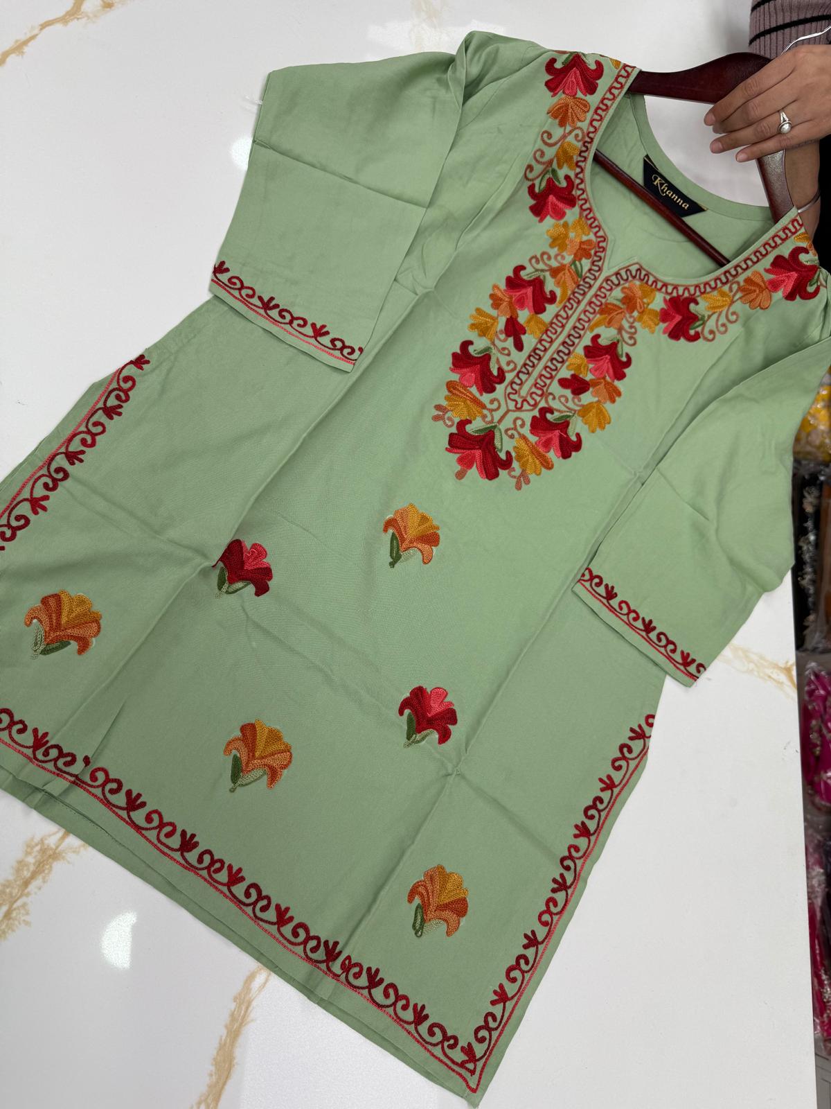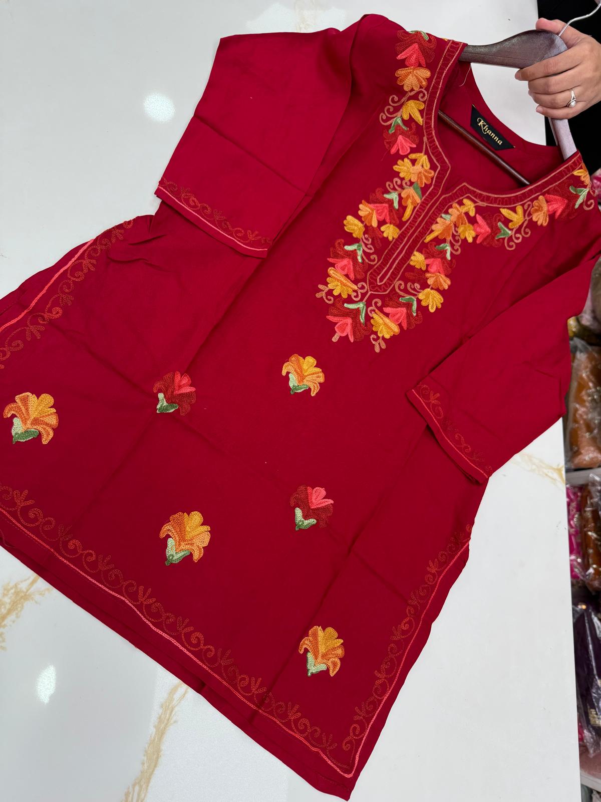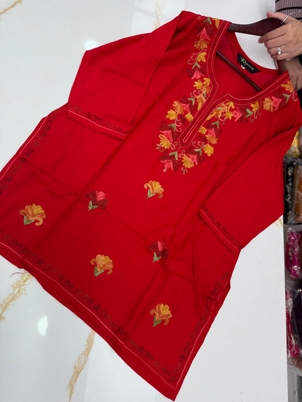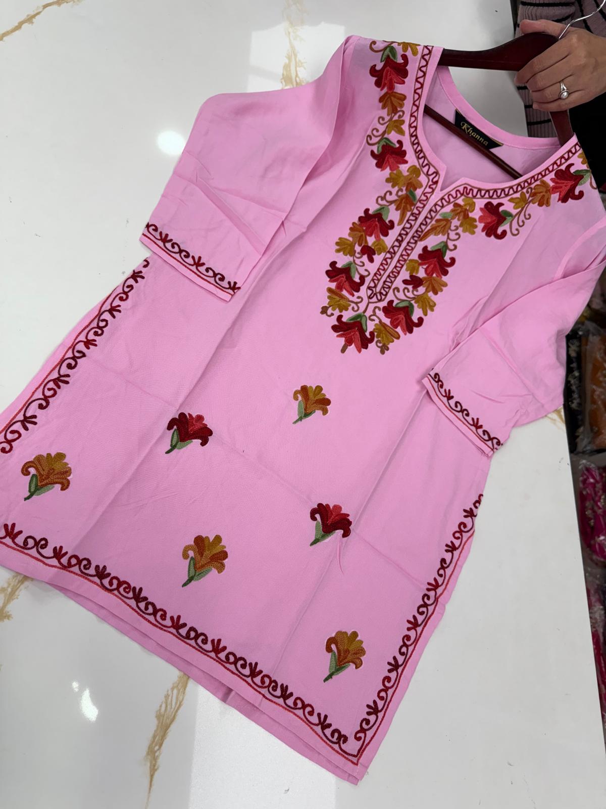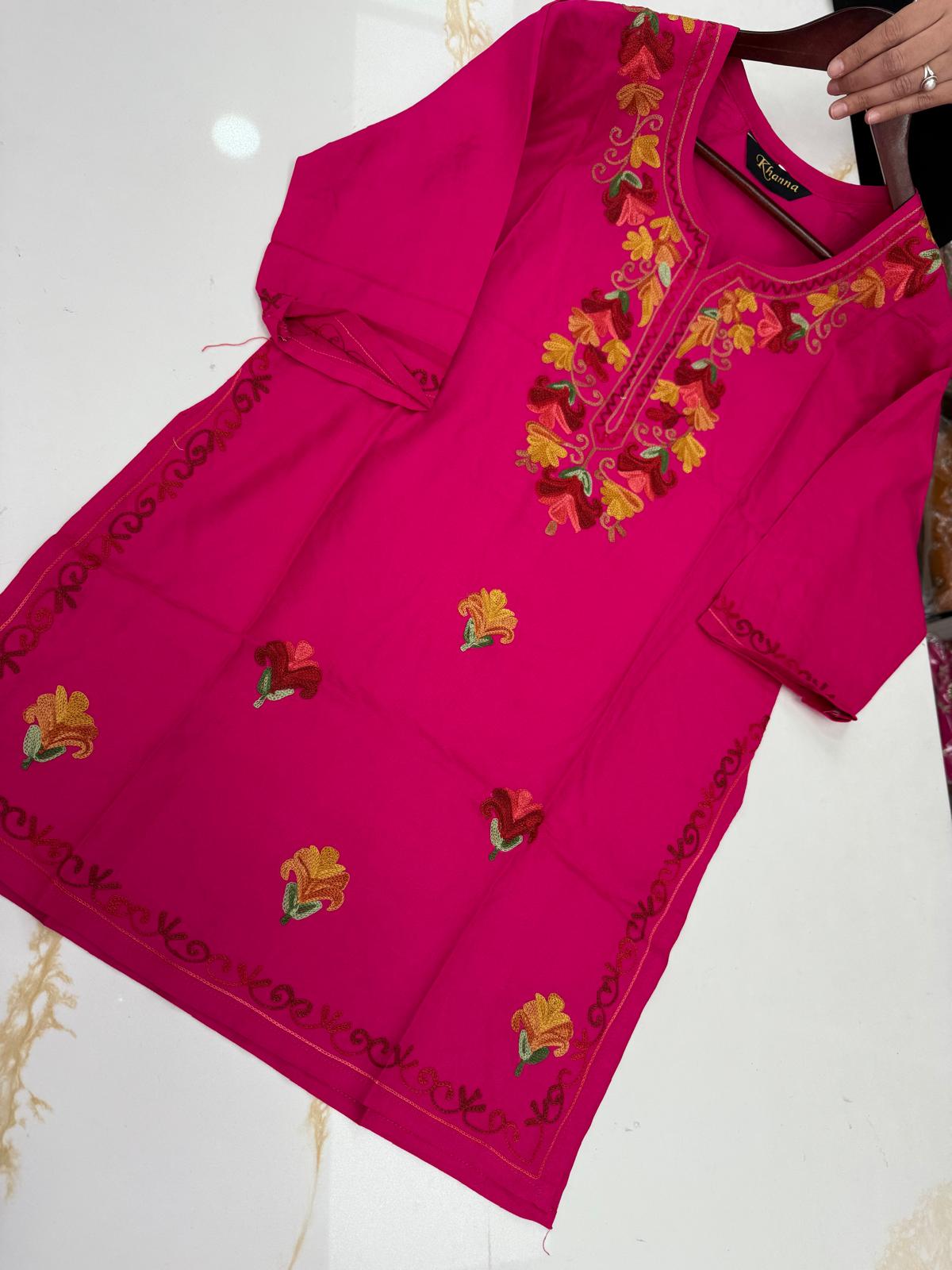 - Beautiful Floral Lakhnawi Embroidered Full Sleeves Rayon Cotton Short Kurti