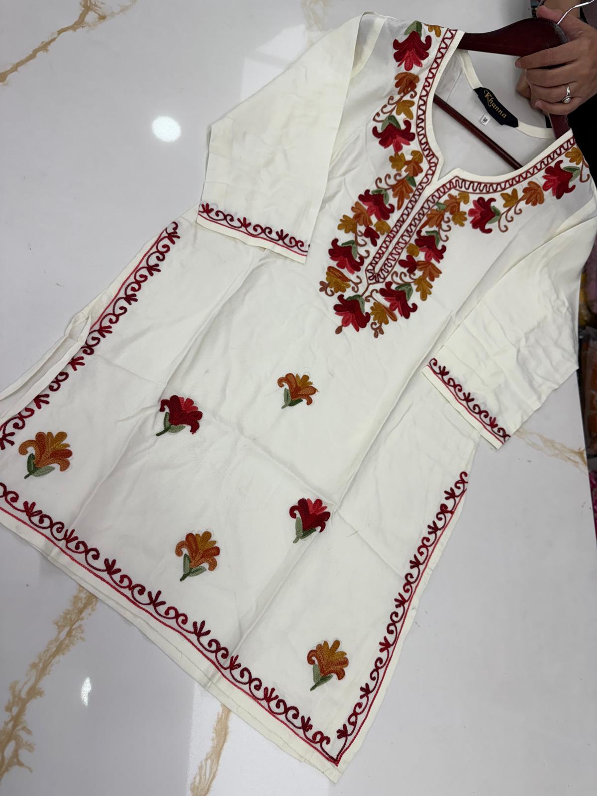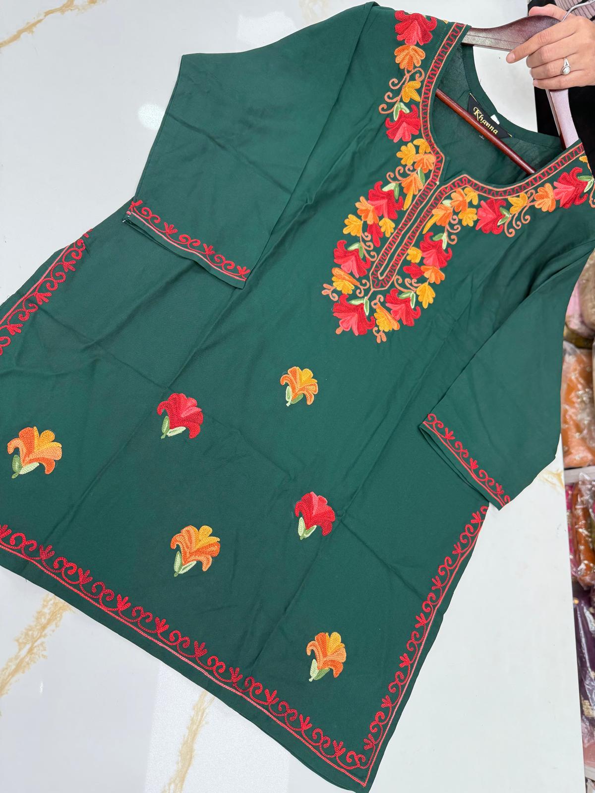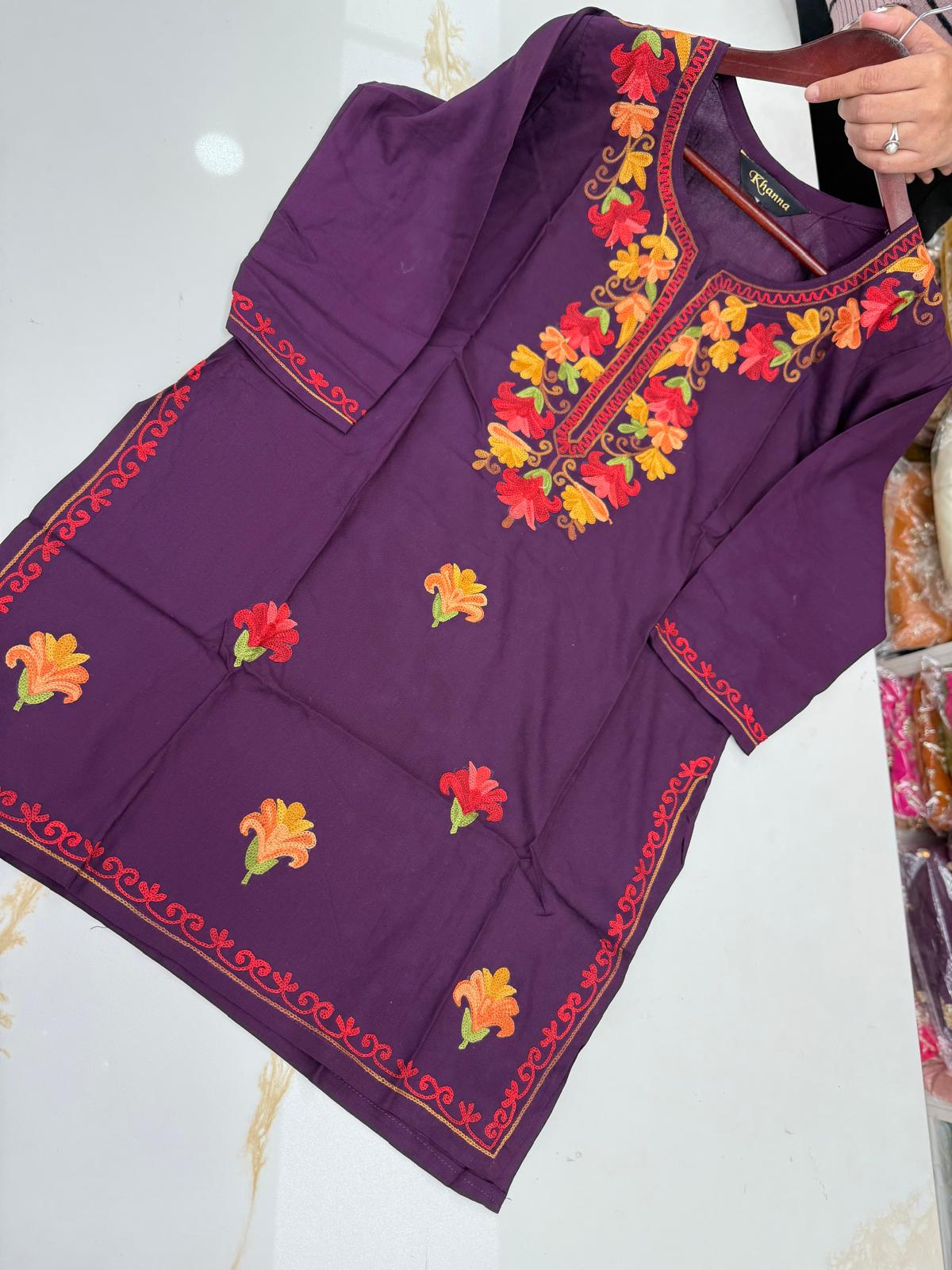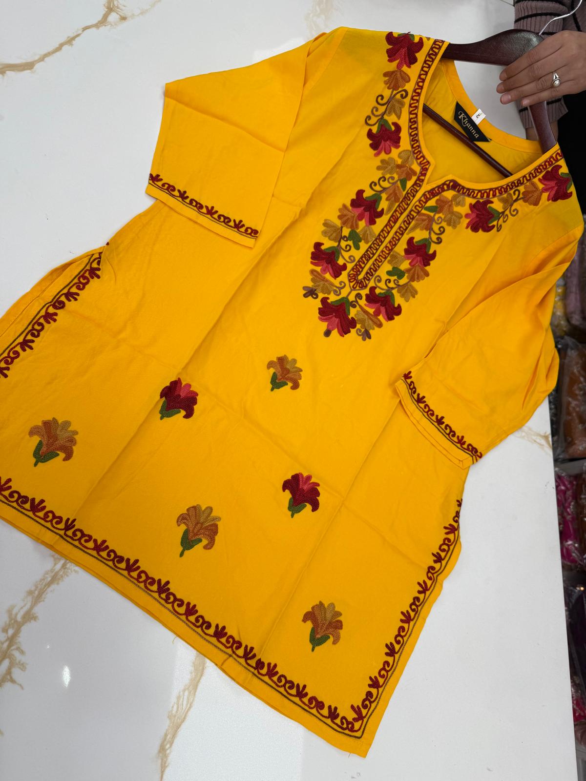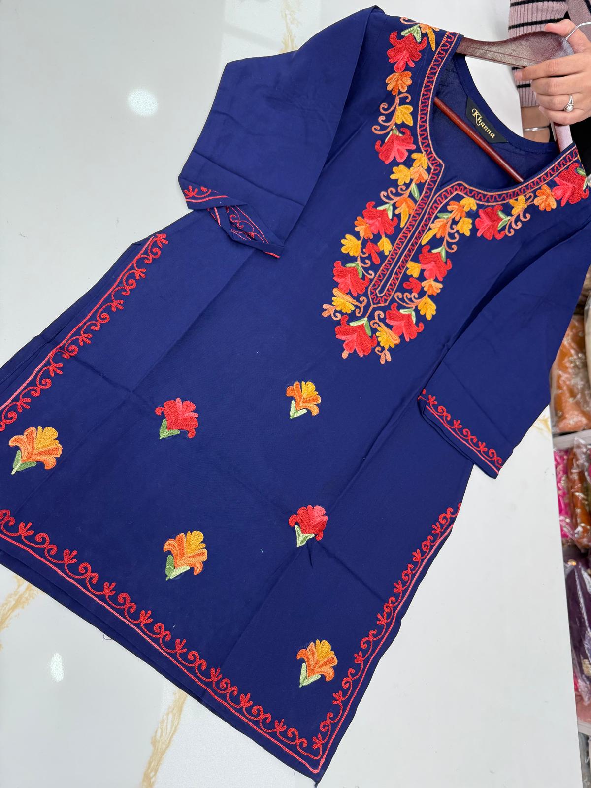 - Beautiful Floral Lakhnawi Embroidered Full Sleeves Rayon Cotton Short Kurti