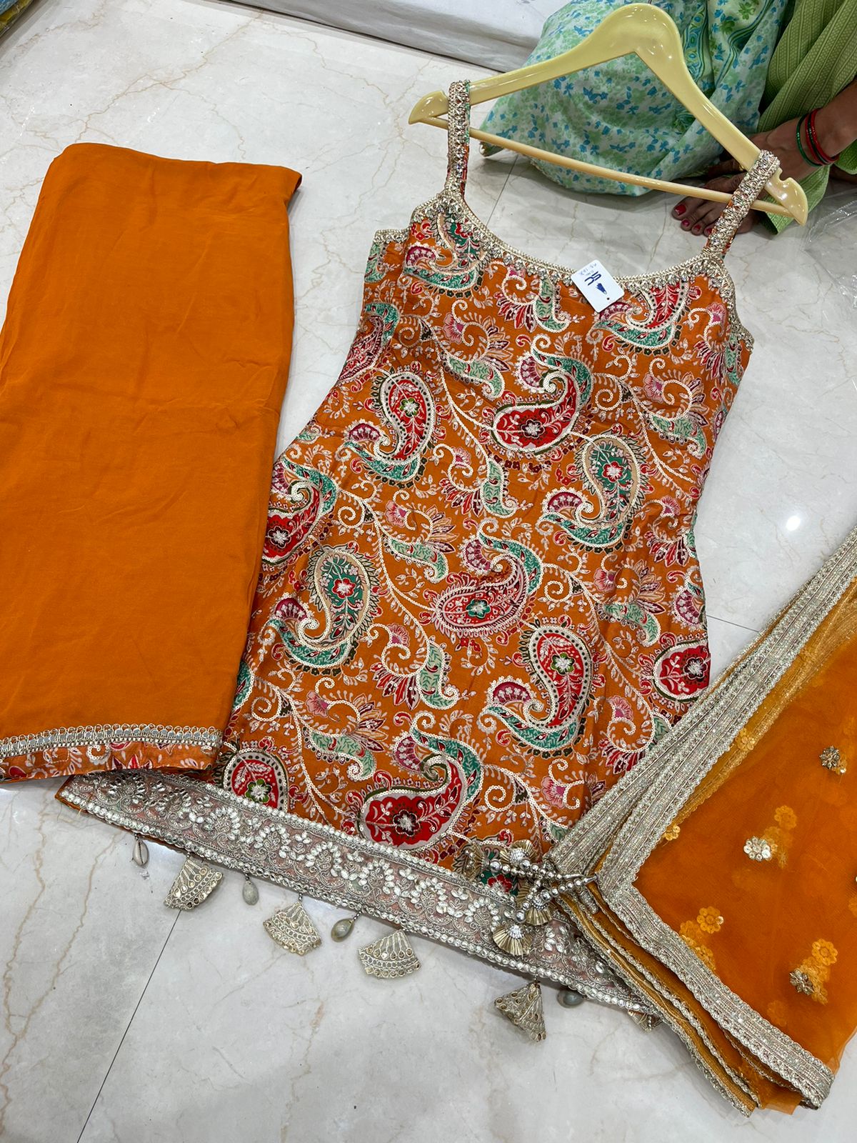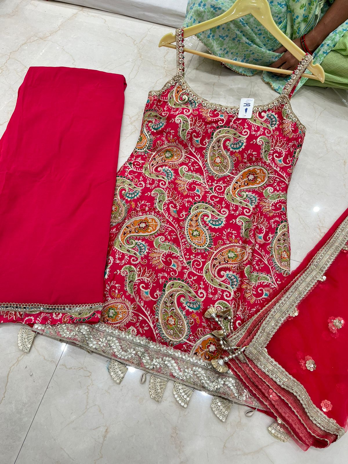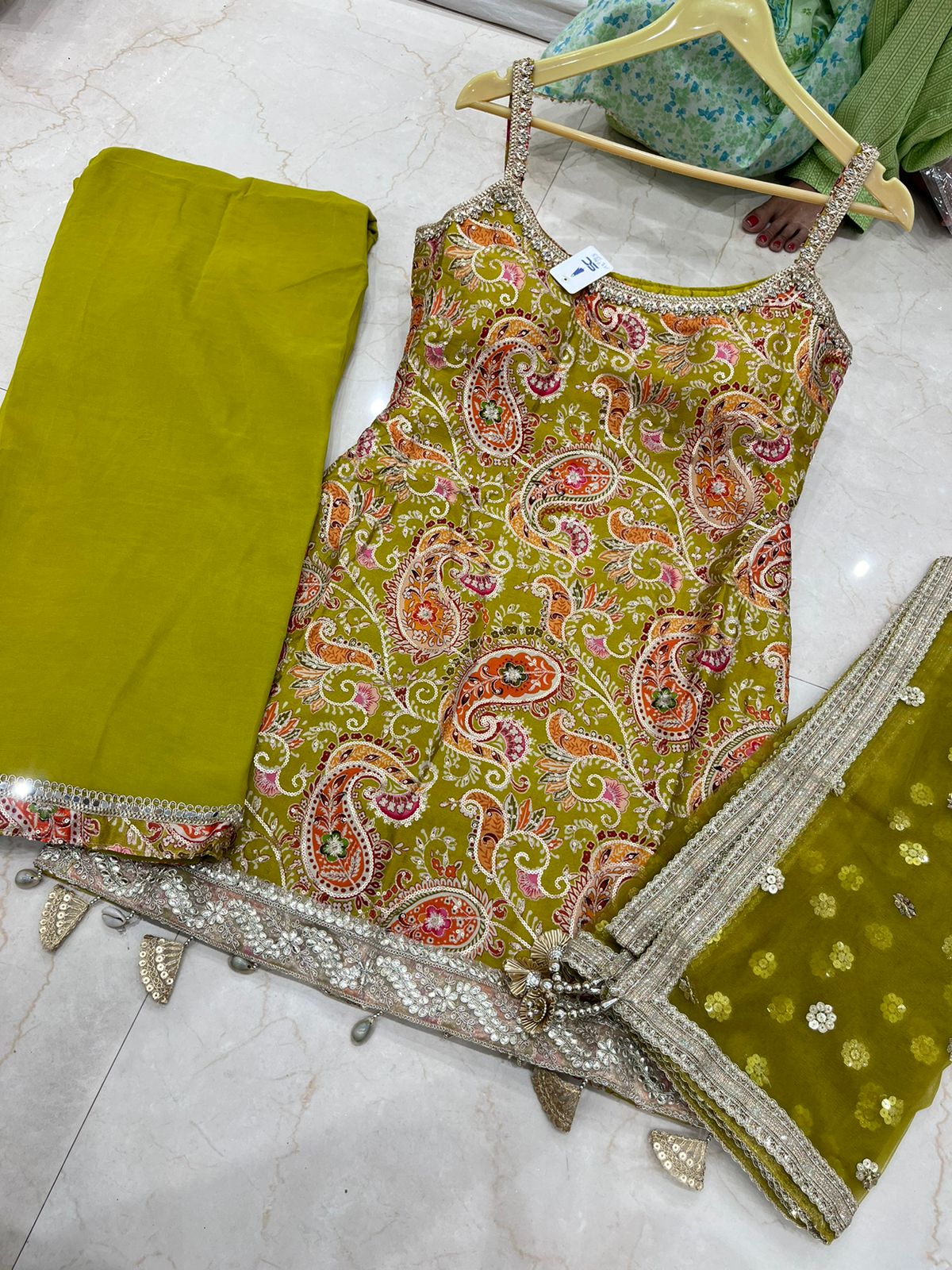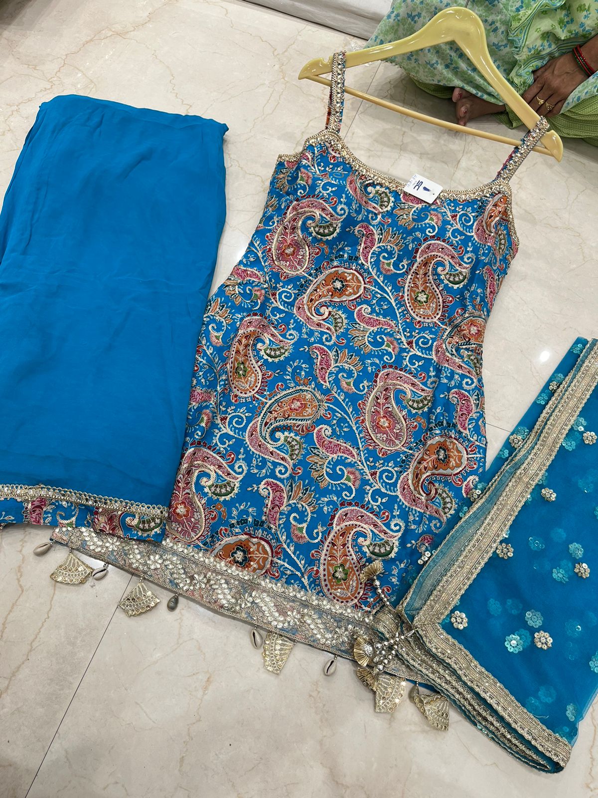 - Boutique Designer Floral Print & Embroidered Strap Style Shirt with Border Embroidered Palazo Bottom.