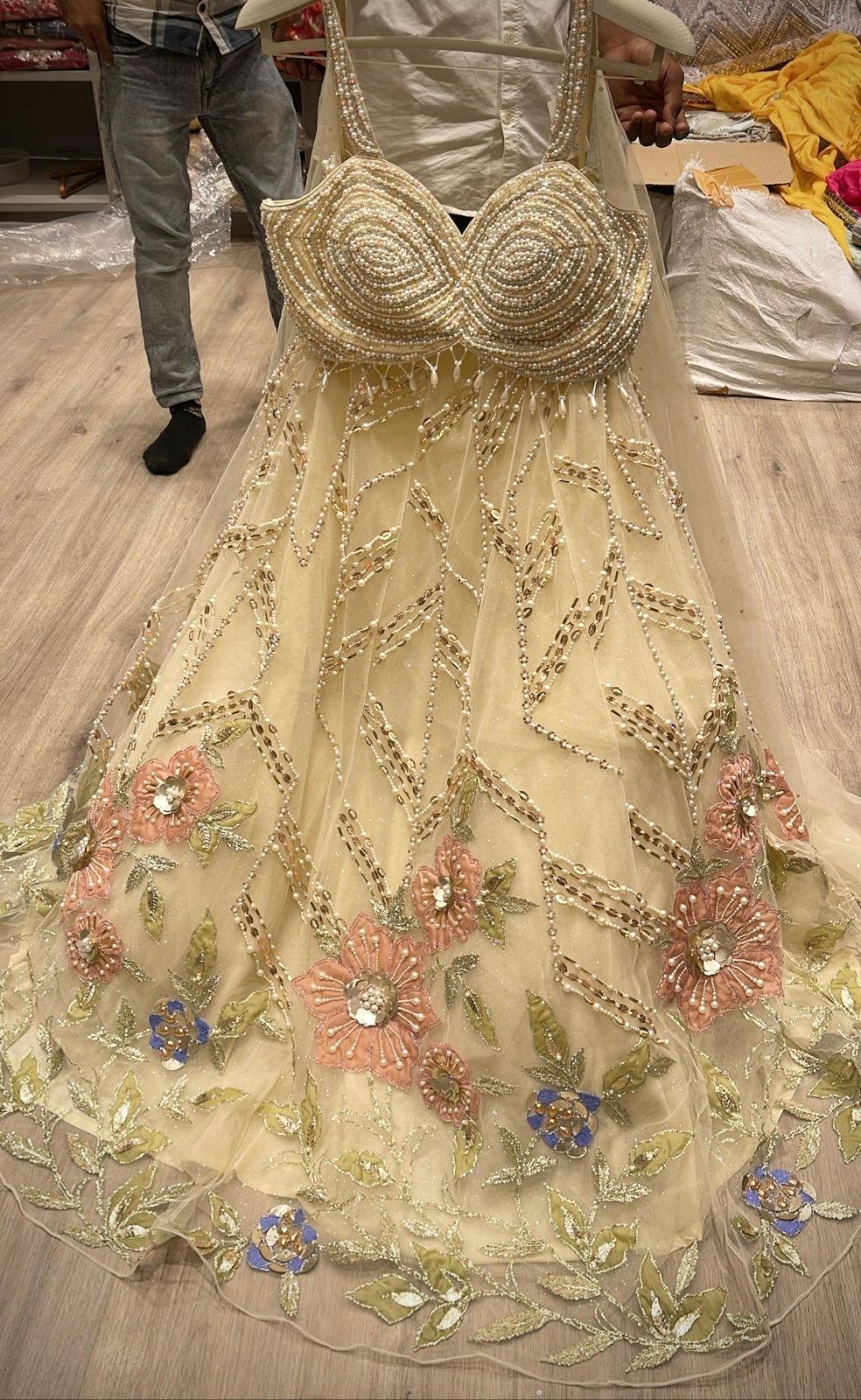 - Boutique Hand Work Embroidered Beige Color Crop Top Strap Style Blouse with Heavy Multi Color Embroidered Lehenga Bottom.