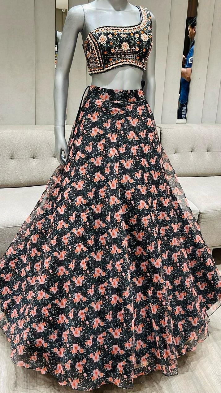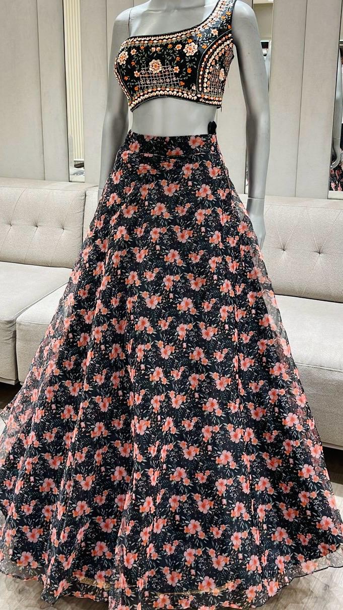 - Boutique Multi Color Hand Embroidered Black Color Crop Top Blouse with Floral Print Lehenga Black Color Lehenga Bottom.