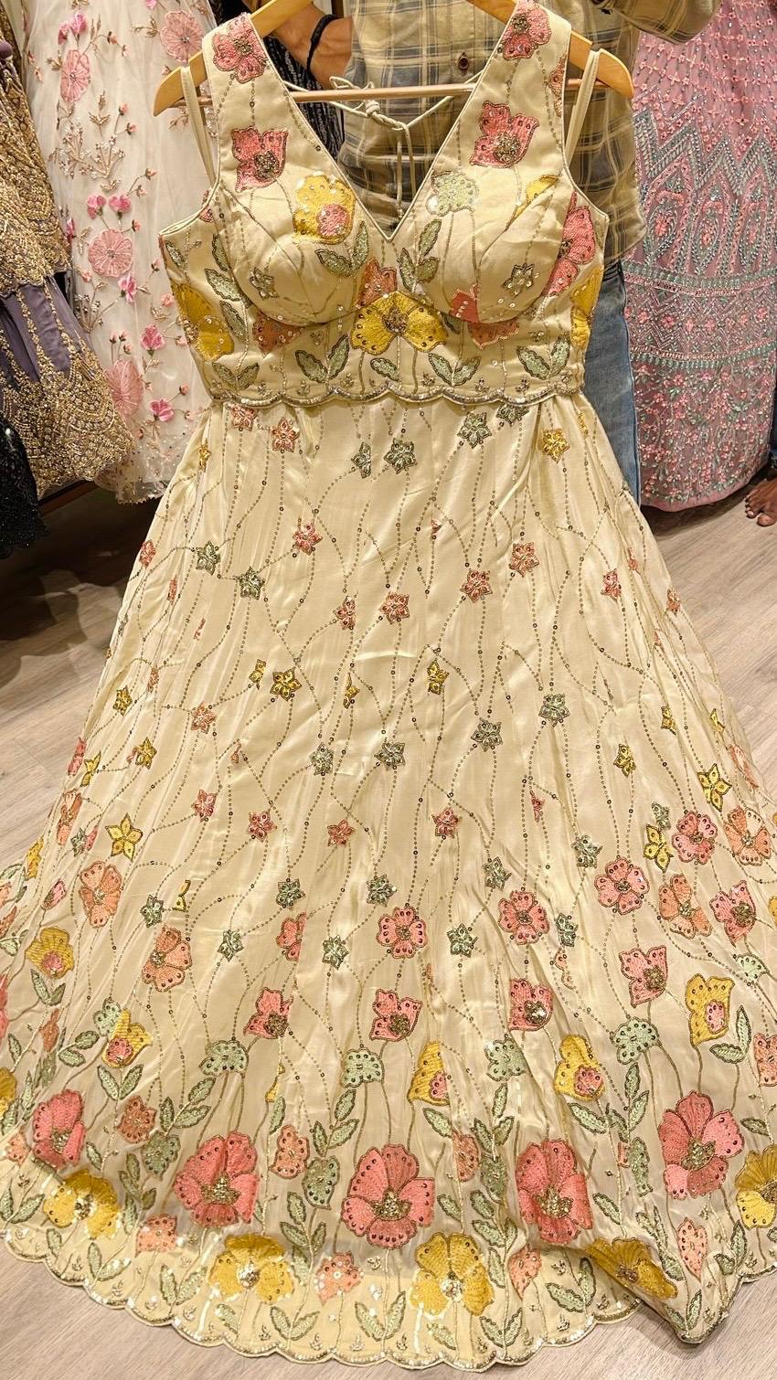 - Elegant Multi Color Floral Embroidered Cream Color Crop Top Blouse with Multi Color Floral Embroidered Cream Color Lehenga Bottom.