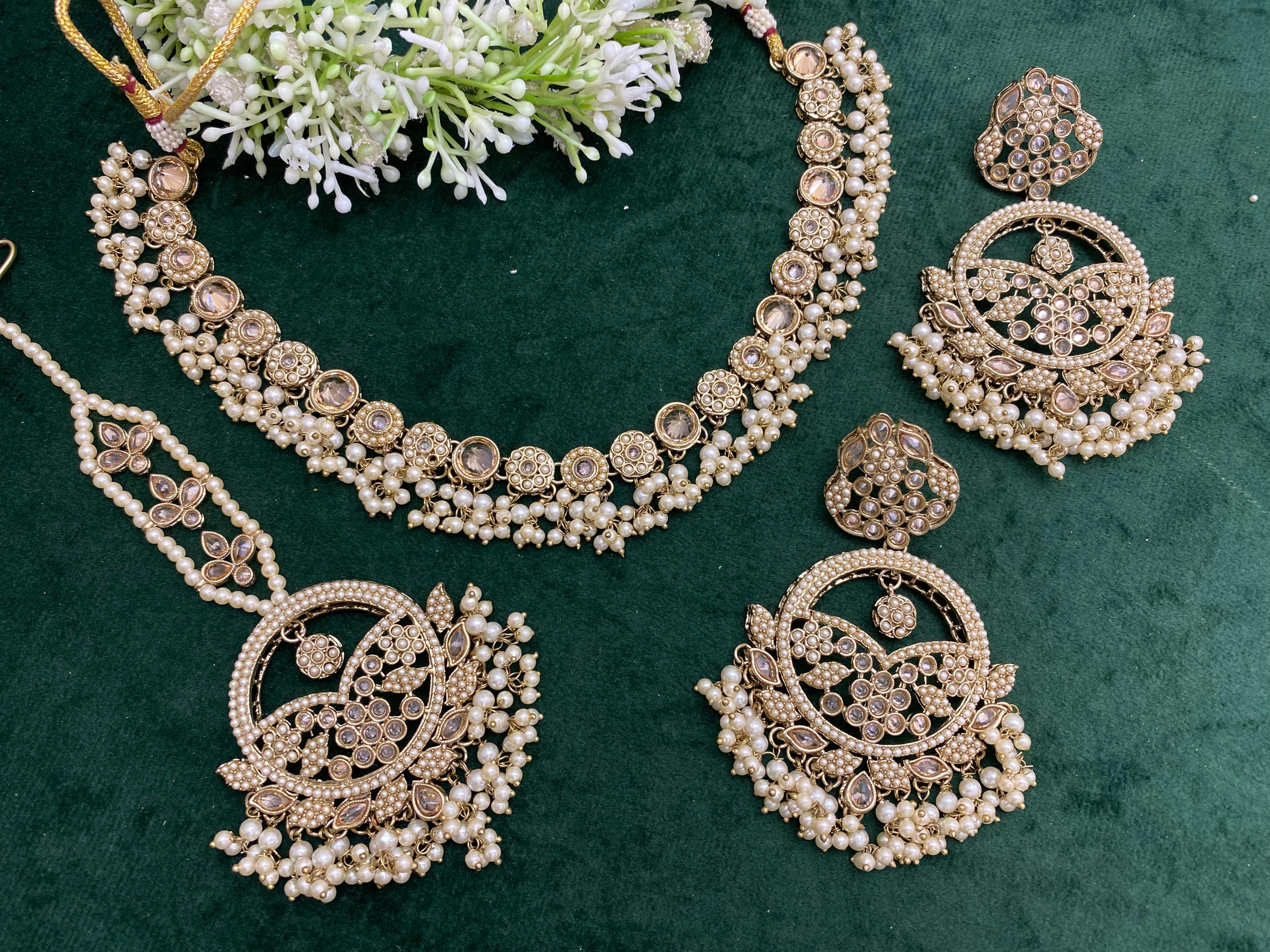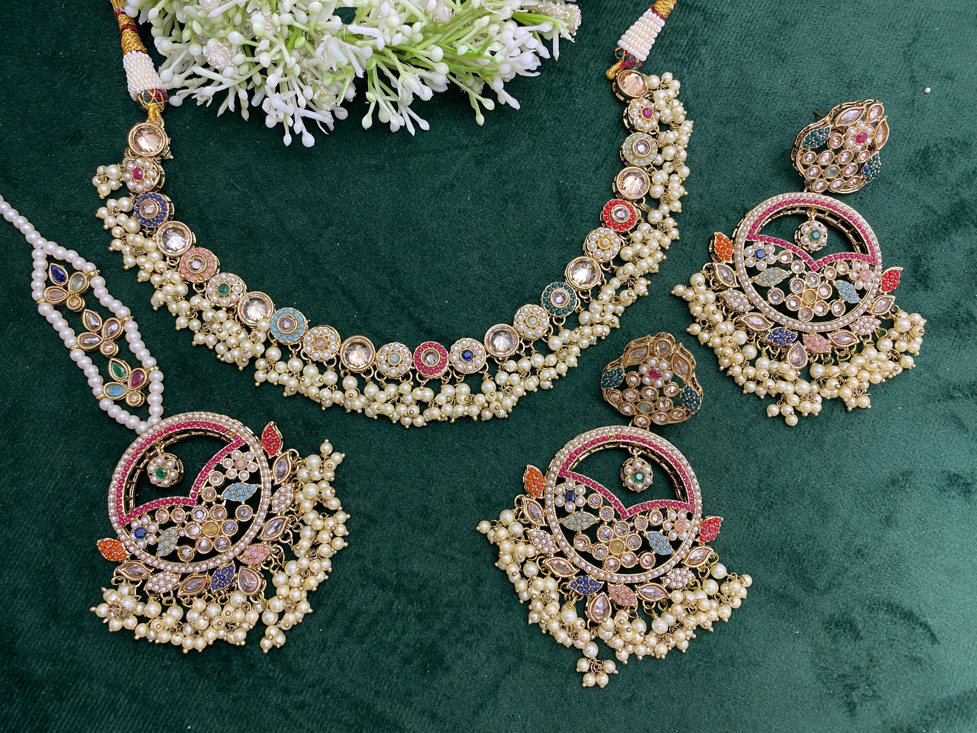 Beautiful Polki Stone Necklace Set with Decent Size Earrings & Tikka - 2 Colors